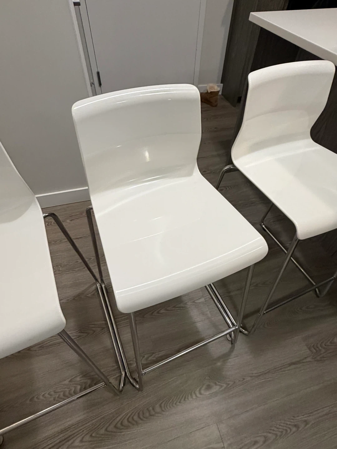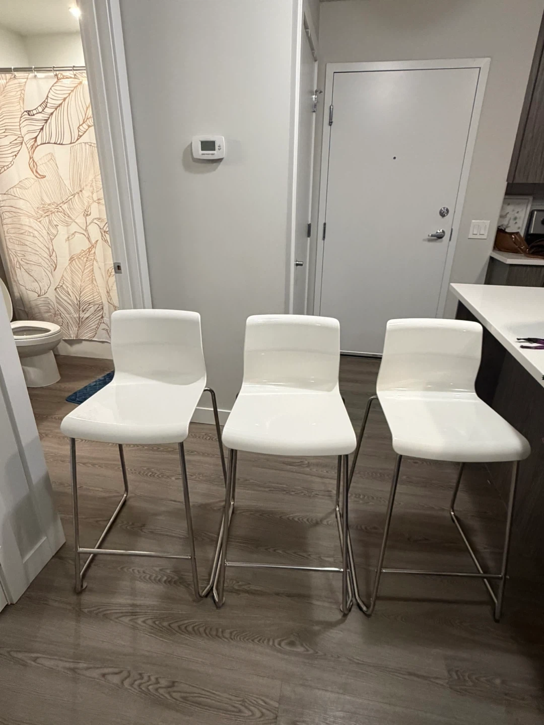 Selling a set of three bar stools! They're in great shape and would look great in any kitchen or bar area. The sleek white design is super versatile and modern. Must pick up as set of 3 pieces.