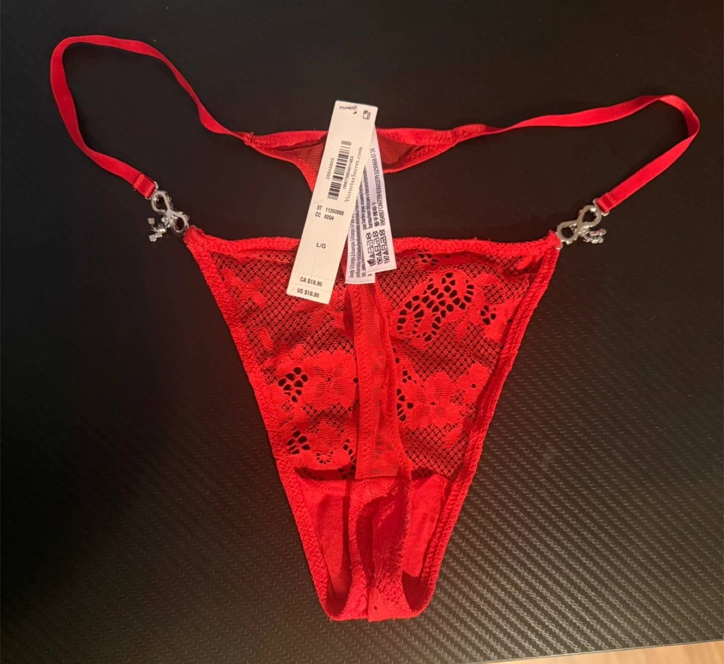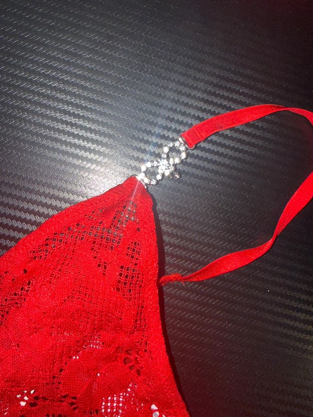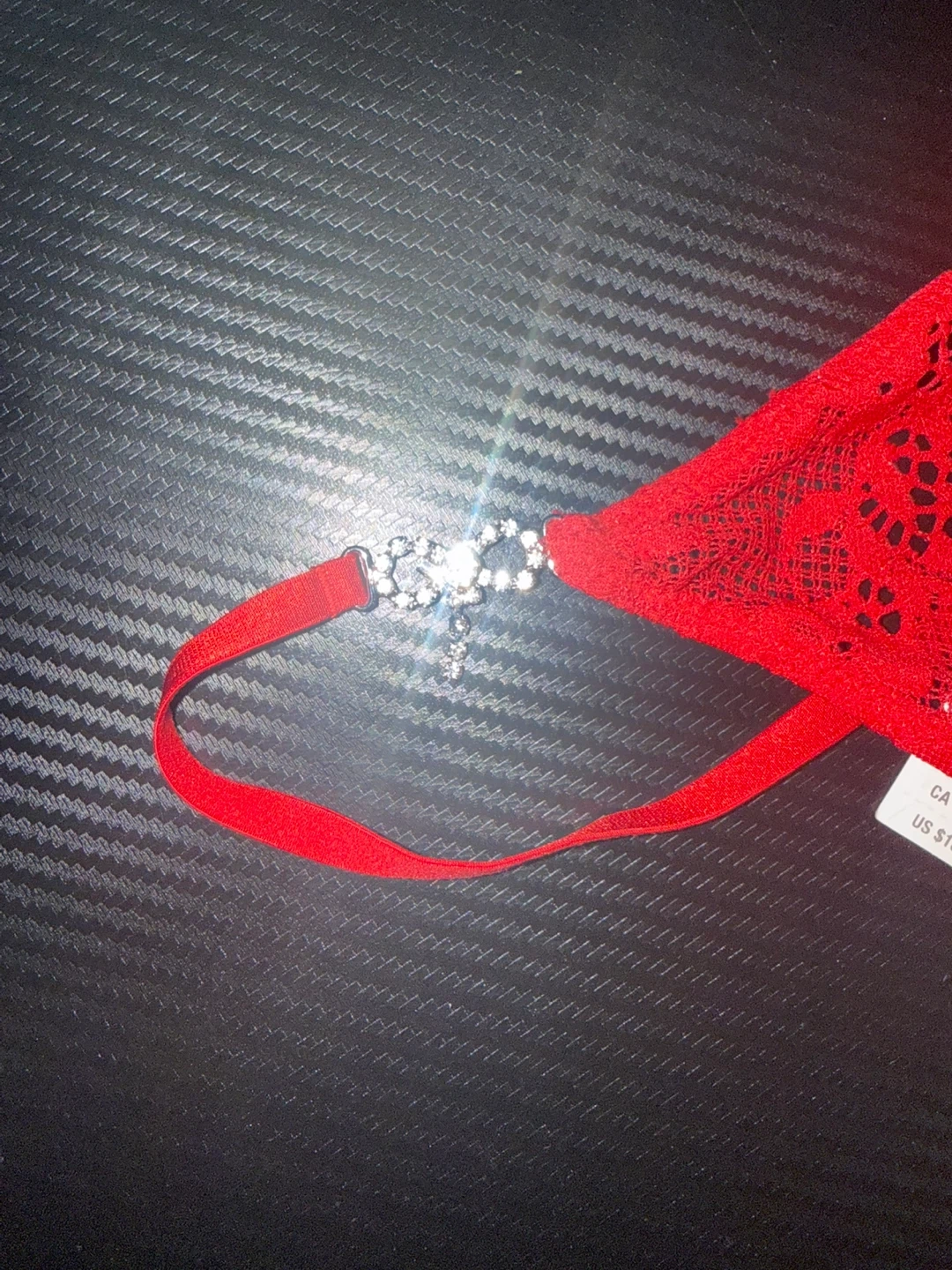 This red lace g-string thong features intricate floral patterns and a sparkly rhinestone embellishment at the sides. It's made with a blend of nylon and spandex for a comfortable fit. The string back design offers minimal coverage.