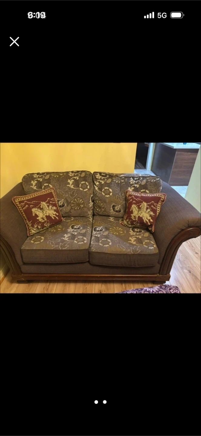 This is a sofa with a brown fabric featuring a floral print. It's a comfy addition to any living space!