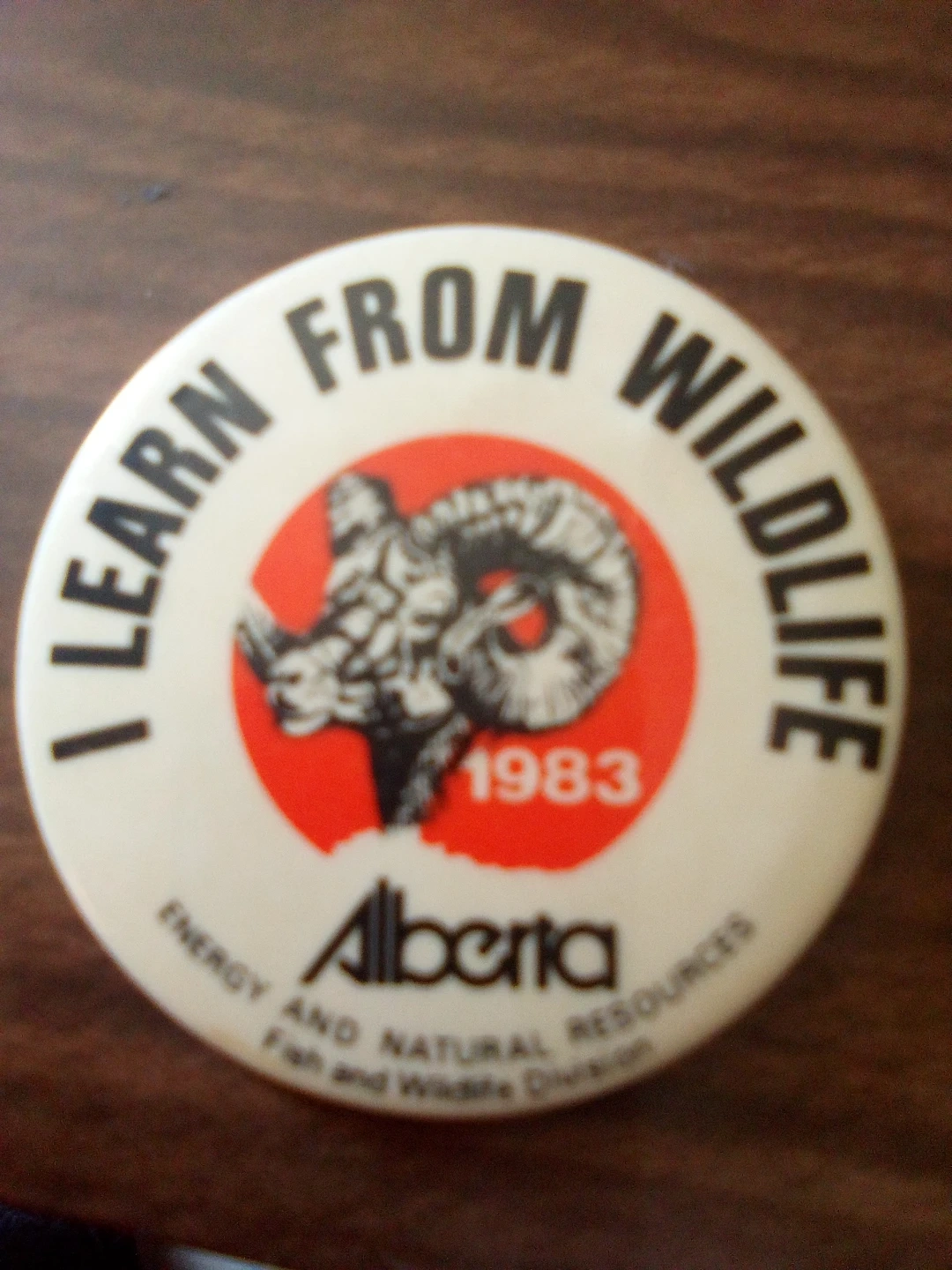 This is a vintage pin from Alberta, featuring the slogan 'I Learn From Wildlife' and the year 1983. It has an image of a bighorn sheep and text indicating 'Energy and Natural Resources, Fish and Wildlife Division'.