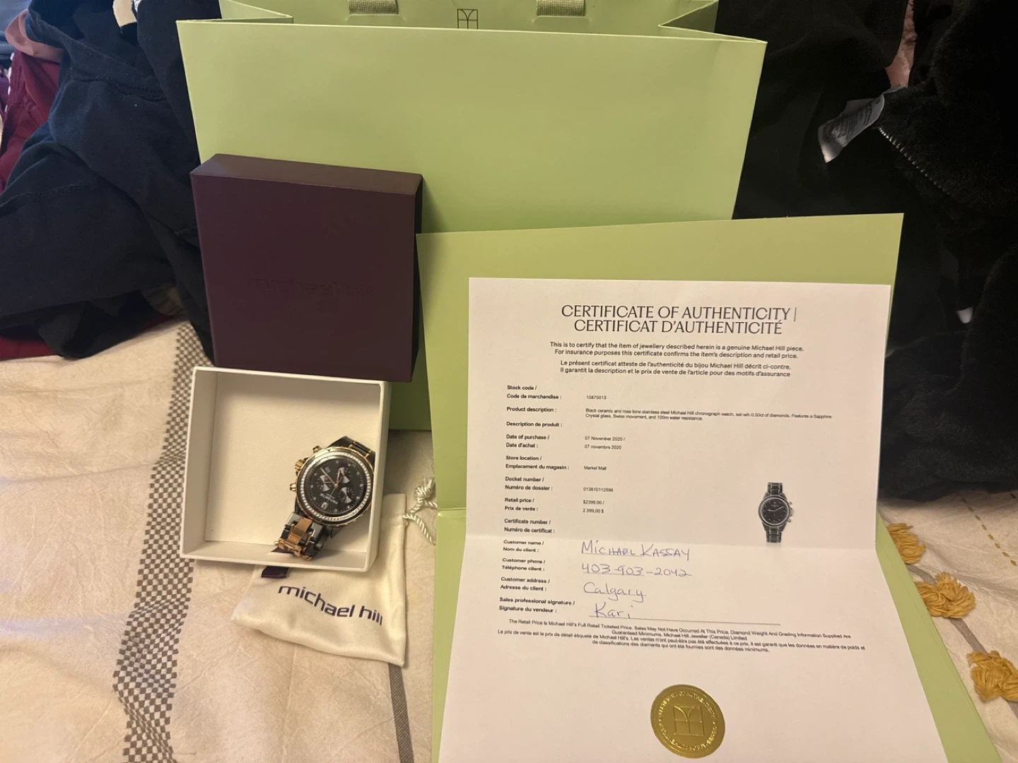 Selling a beautiful Michael Hill ladies chronograph watch. It features a black ceramic and rose tone stainless steel design, crystal glass, Swiss movement, and is 100m water resistant. The watch is set with 0.50ct of diamonds. It was originally purchased at Market Mall on 07 November 2020. Includes the original box and certificate of authenticity. Originally retailed for $2399.00