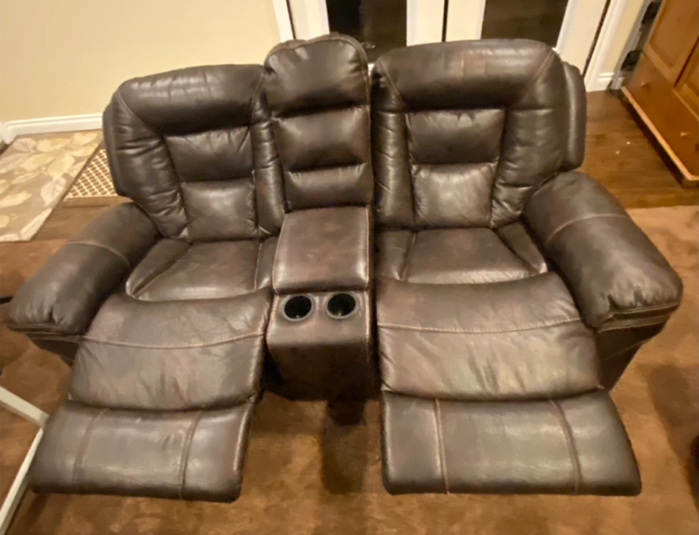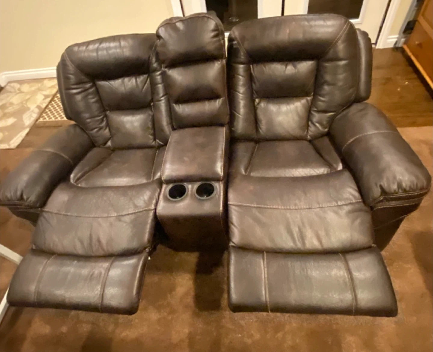 2 - Brown Leather Loveseat Recliner with Cup Holders