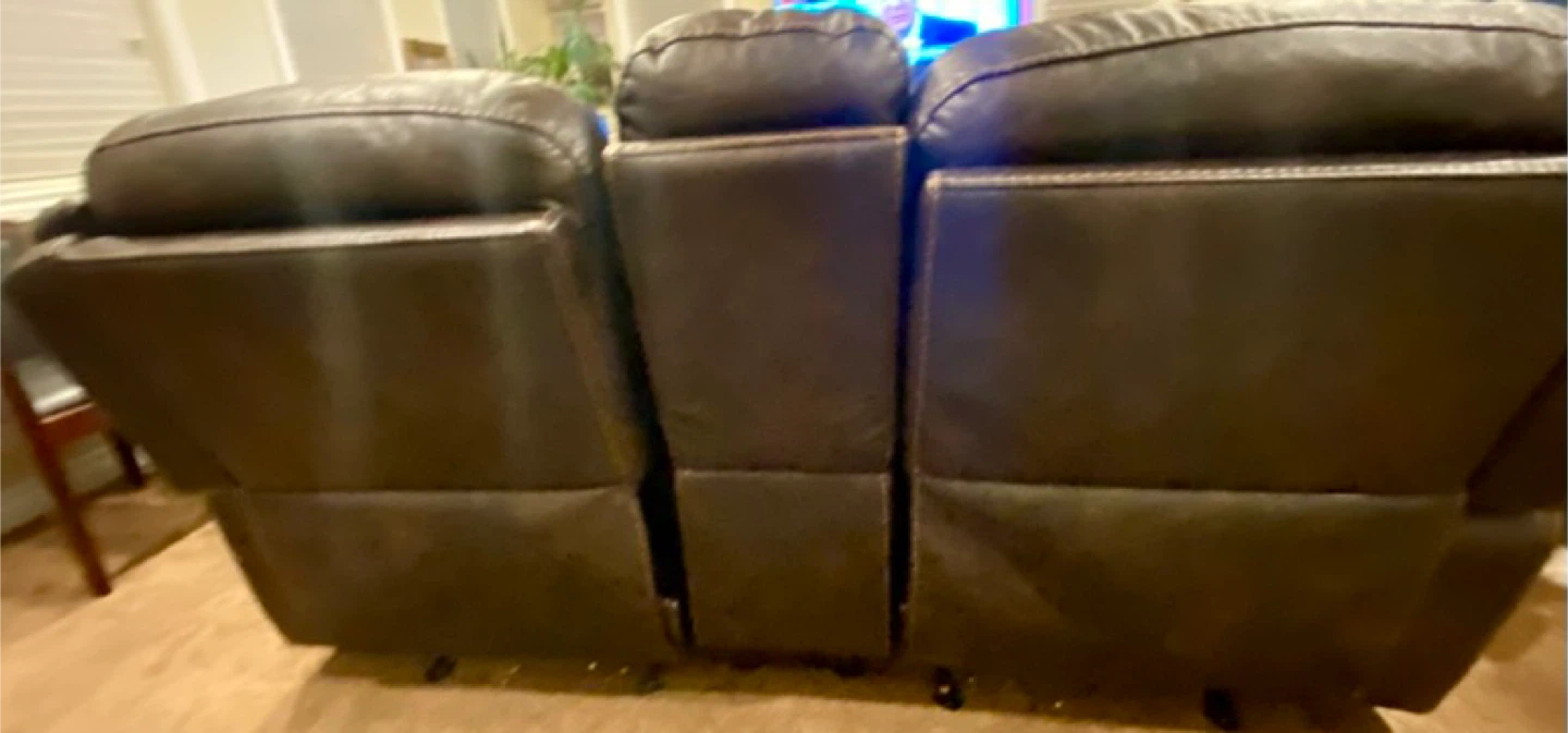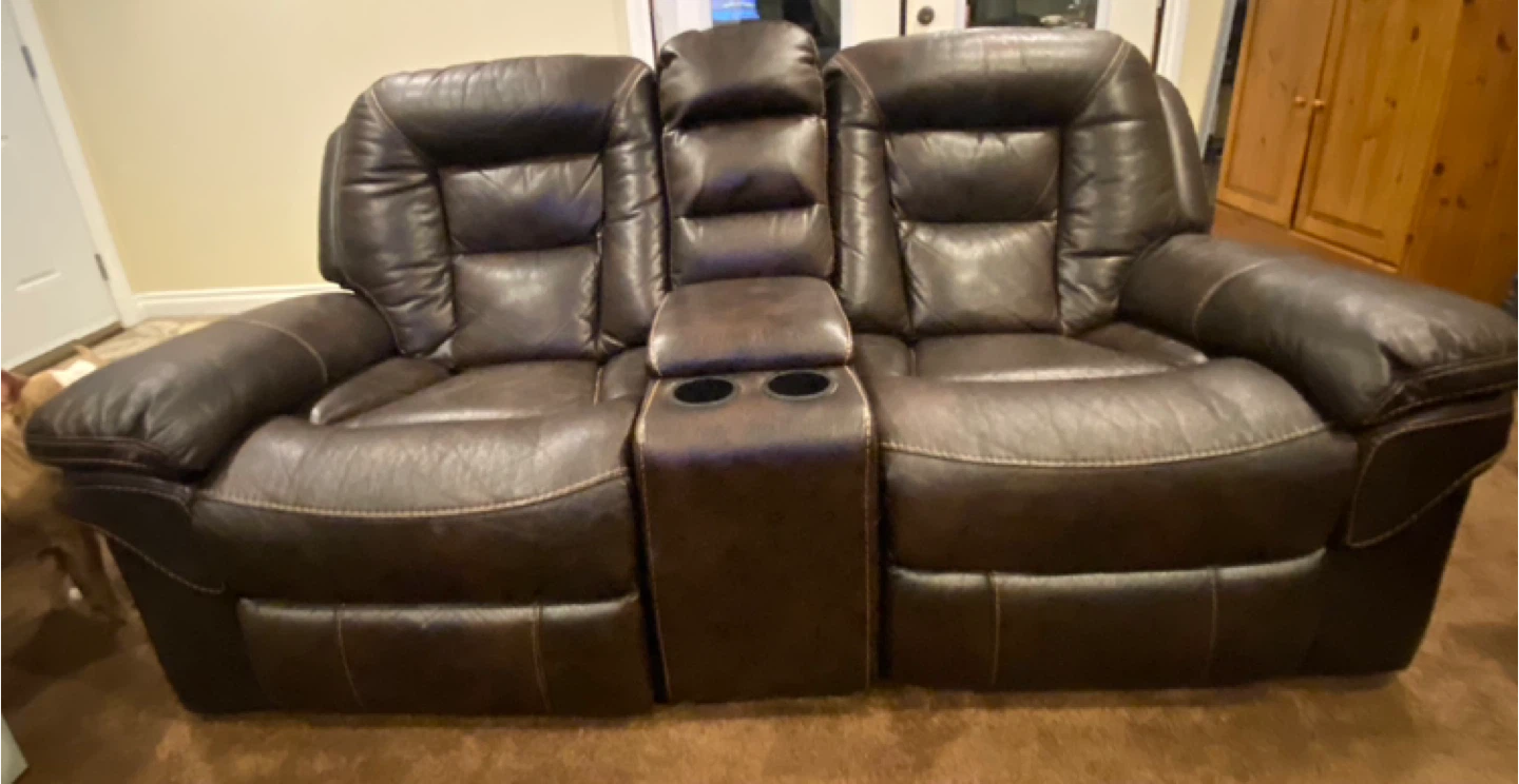 $295 each or $575 for both / Comfortable brown leather loveseat recliners with a centre console and two cup holders. It features plush cushioning and reclining seats for ultimate relaxation. Both loveseats are for a home theatre setup or cozy living room. In good condition.