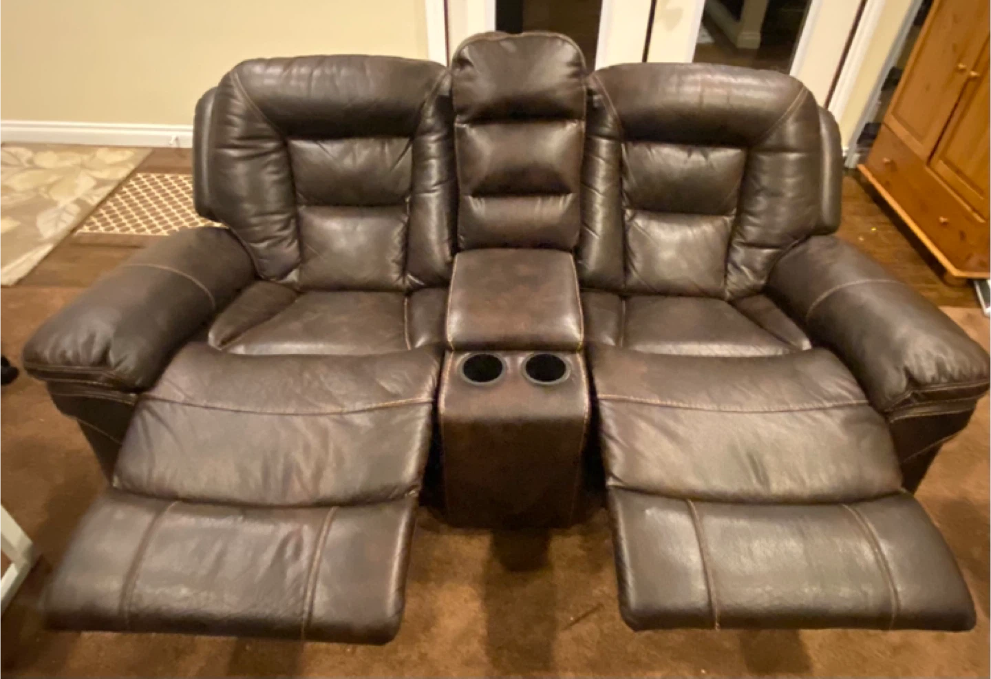 2 - Brown Leather Loveseat Recliner with Cup Holders