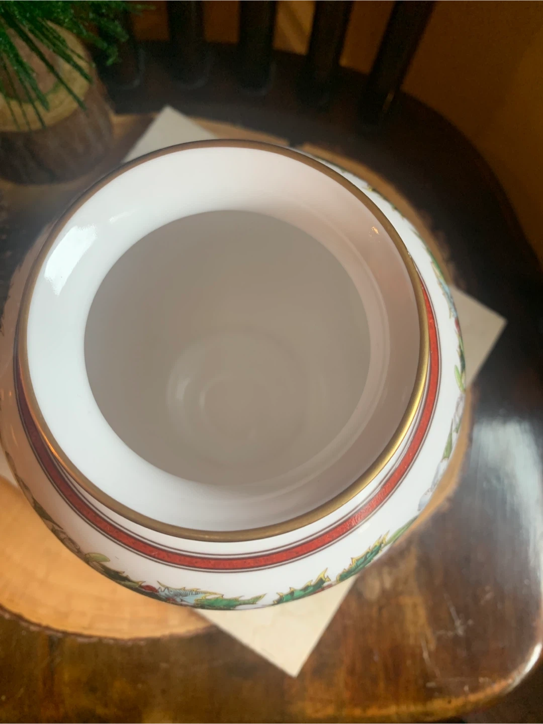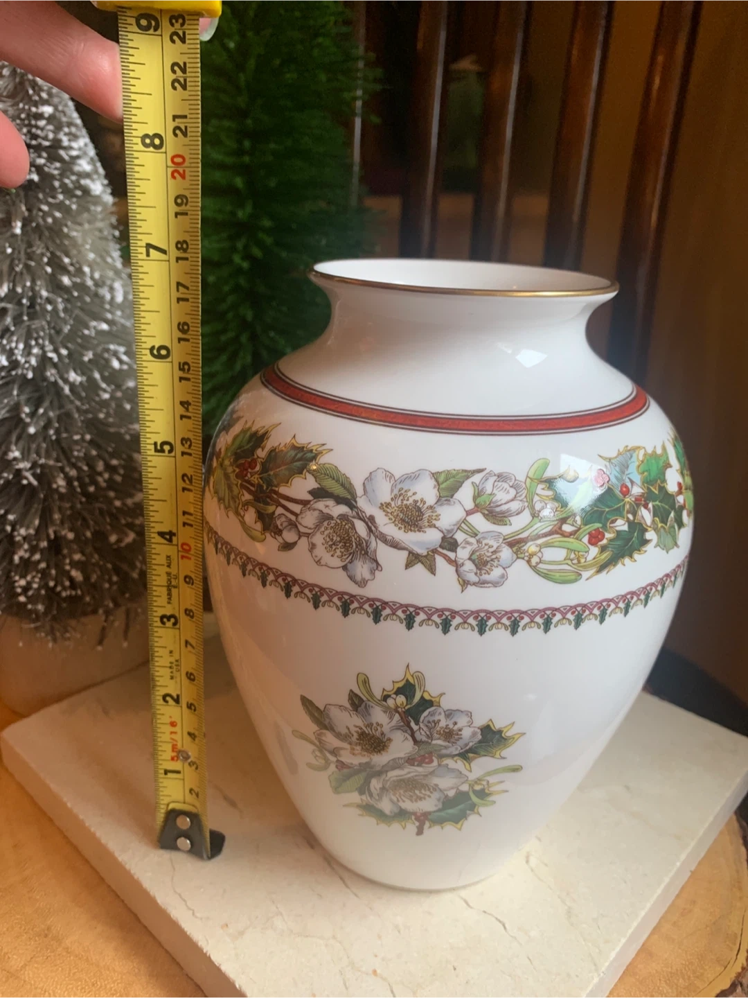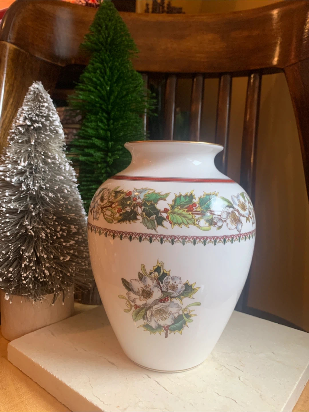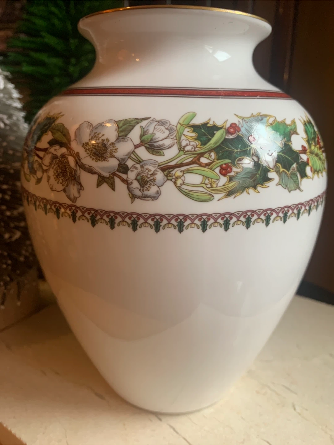 This is a Spode "Christmas Rose" vase. It's made of fine bone china and from England. The vase features a festive holly and floral design, with the rose on both sides and Holly design around the top. There is gold trim around the rim and base. No cracks or chips on it. I believe this pattern has been discontinued. Perfect for some dried or fresh flowers!