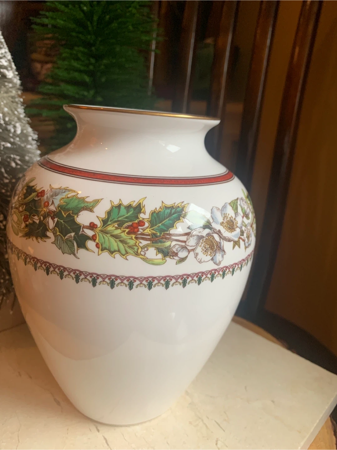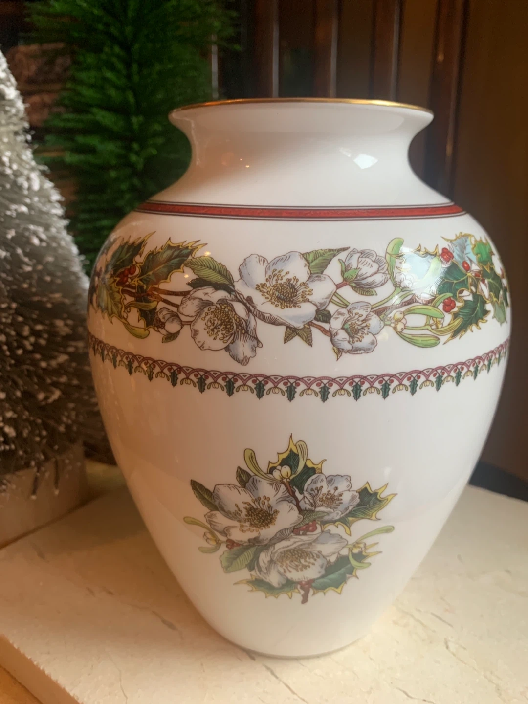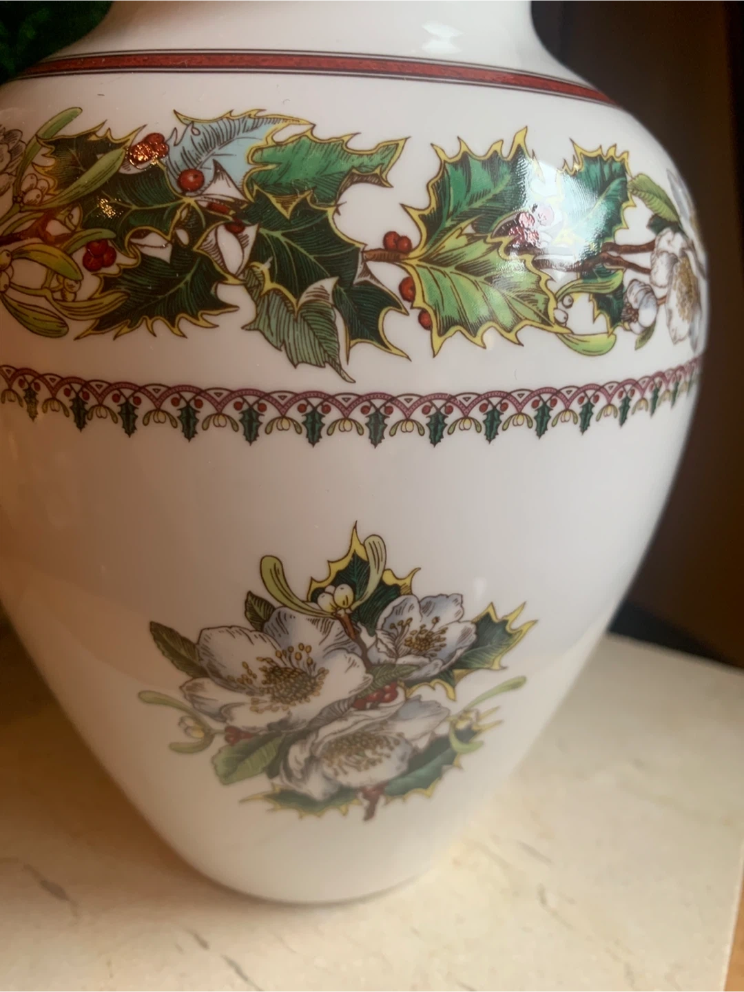 This is a Spode "Christmas Rose" vase. It's made of fine bone china and from England. The vase features a festive holly and floral design, with the rose on both sides and Holly design around the top. There is gold trim around the rim and base. No cracks or chips on it. I believe this pattern has been discontinued. Perfect for some dried or fresh flowers!