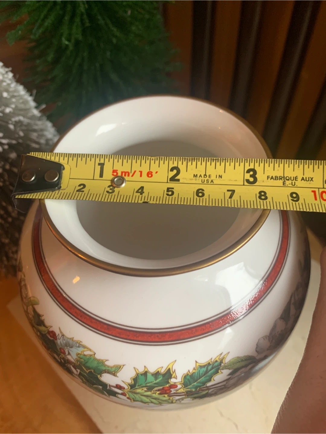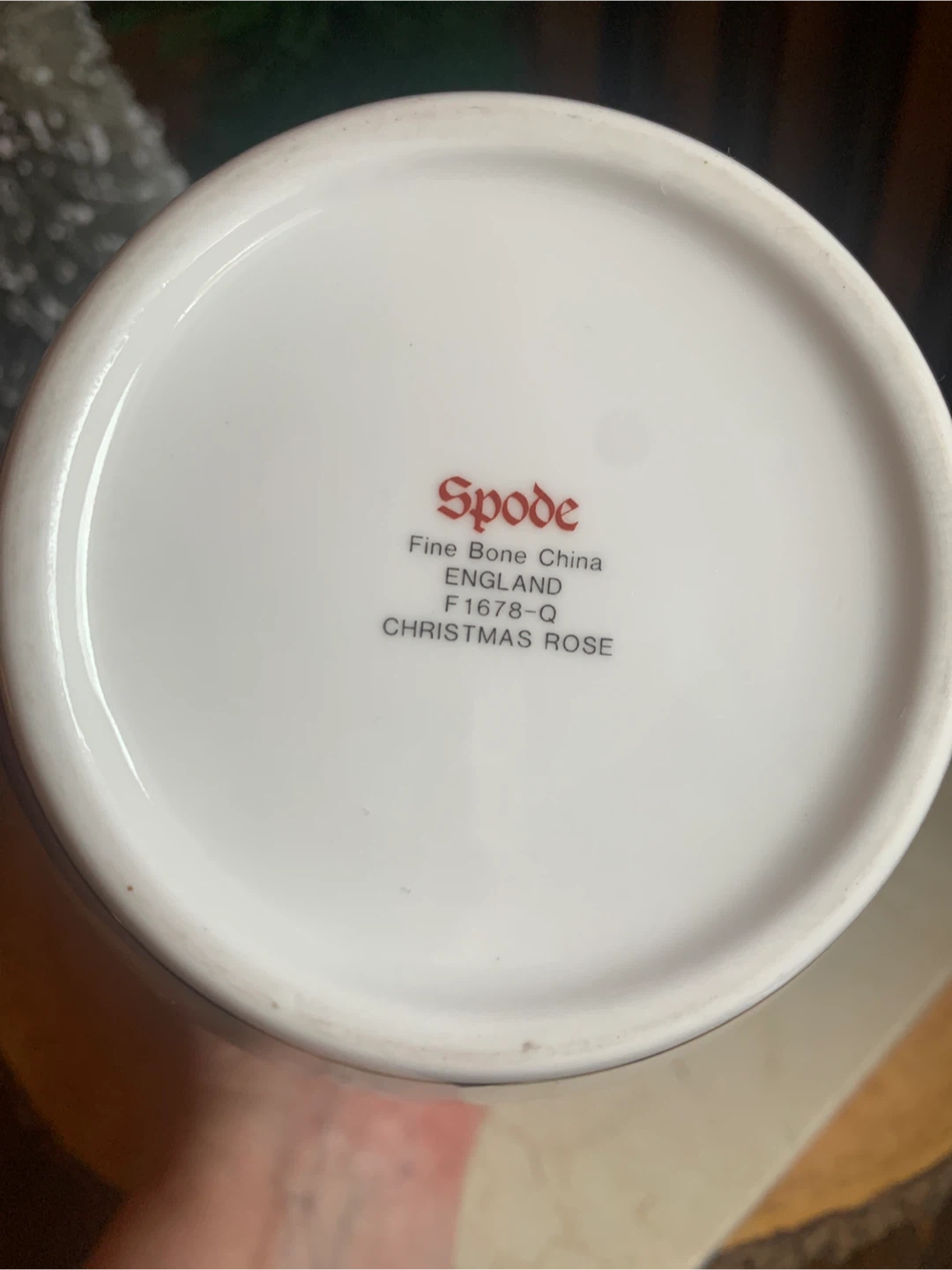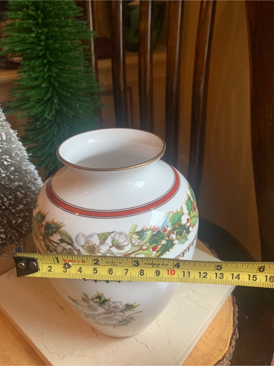 This is a Spode "Christmas Rose" vase. It's made of fine bone china and from England. The vase features a festive holly and floral design, with the rose on both sides and Holly design around the top. There is gold trim around the rim and base. No cracks or chips on it. I believe this pattern has been discontinued. Perfect for some dried or fresh flowers!