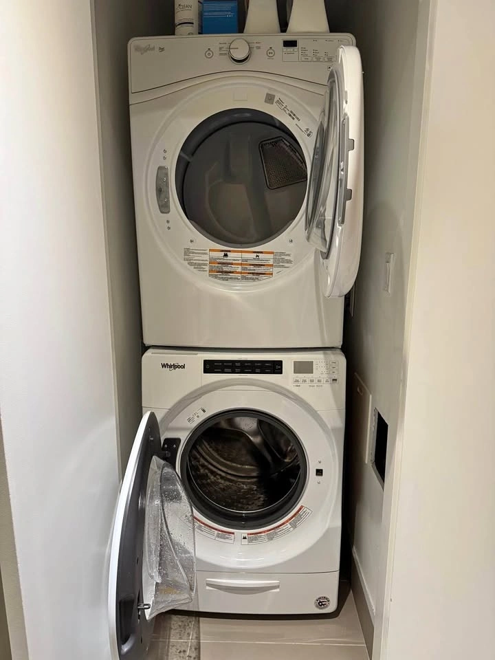 Came with apartment, fully functional, very large drums. Dryer is vented and requires access to an external vent. Some blue marks on the inside dryer drum, seems like ink, likely comes off with some bleach or rubbing alcohol. Requires pick up in central Coquitlam.