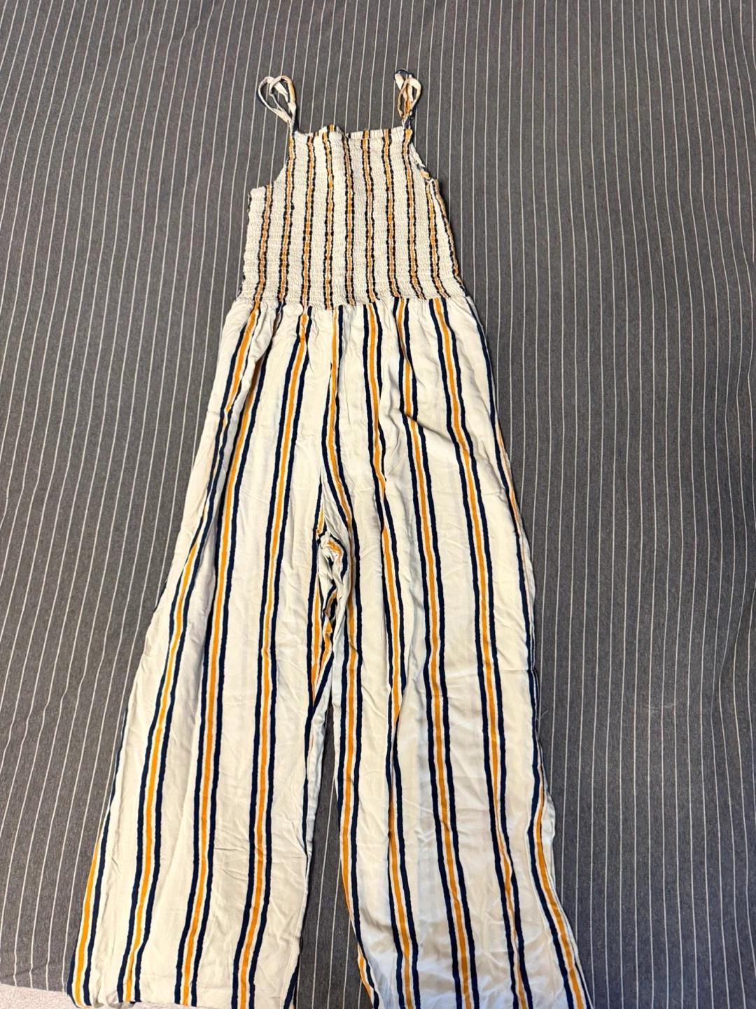 This is a cute striped jumpsuit with a smocked bodice and wide legs. It's made of a lightweight fabric, perfect for warmer weather. The straps are adjustable. It's a fun piece for casual wear!
