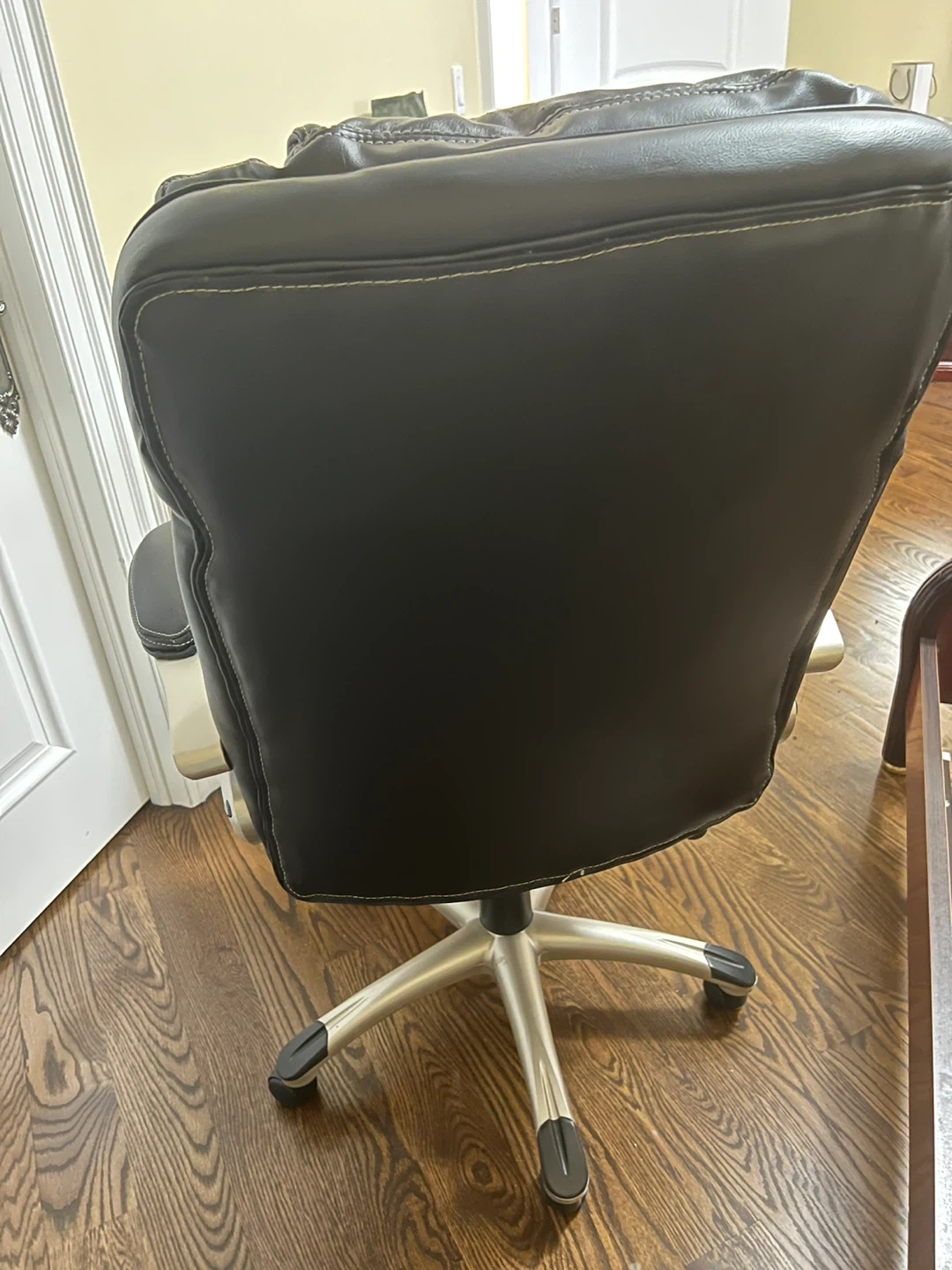 This black office chair has a faux leather finish and a metal base with casters. The seat shows some wear and tear. It's a standard office chair with adjustable height and a swivel base.