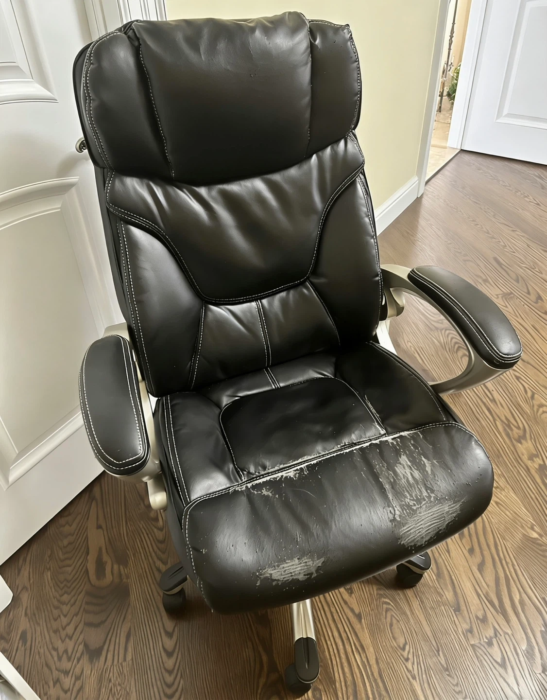 This black office chair has a faux leather finish and a metal base with casters. The seat shows some wear and tear. It's a standard office chair with adjustable height and a swivel base.