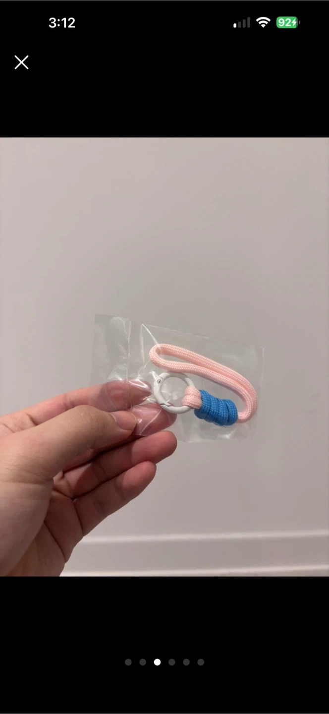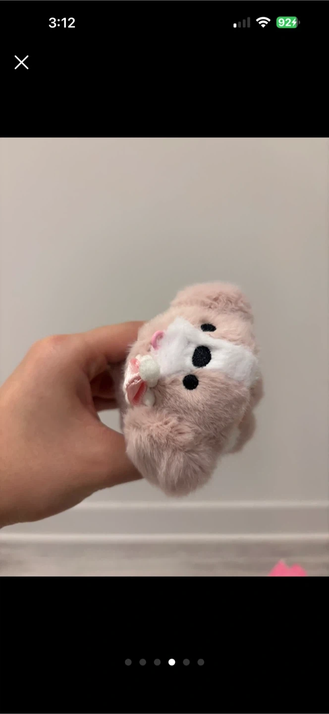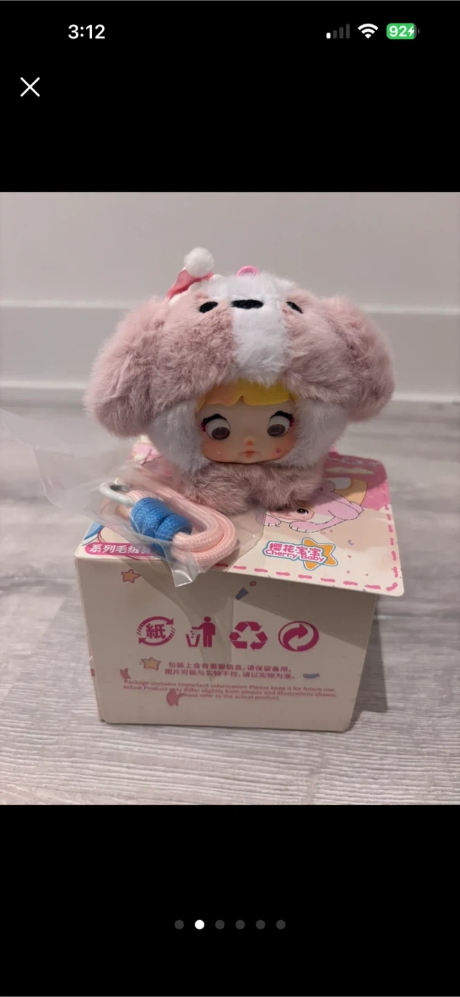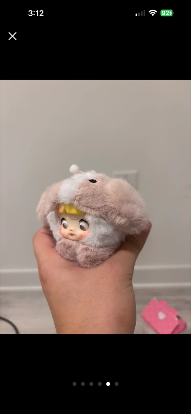 This is a super cute plush toy with a fluffy pink and white exterior, resembling a character with a pink bow. It comes with a white clip and a braided cord keychain. It's a great little accessory for bags or keys!