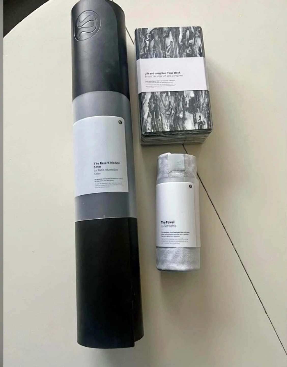 Lululemon yoga mat bundle. Includes The Reversible Mat 5mm, one yoga blocks, and a lightweight towel. Black marble print mat. Perfect for yoga practice.