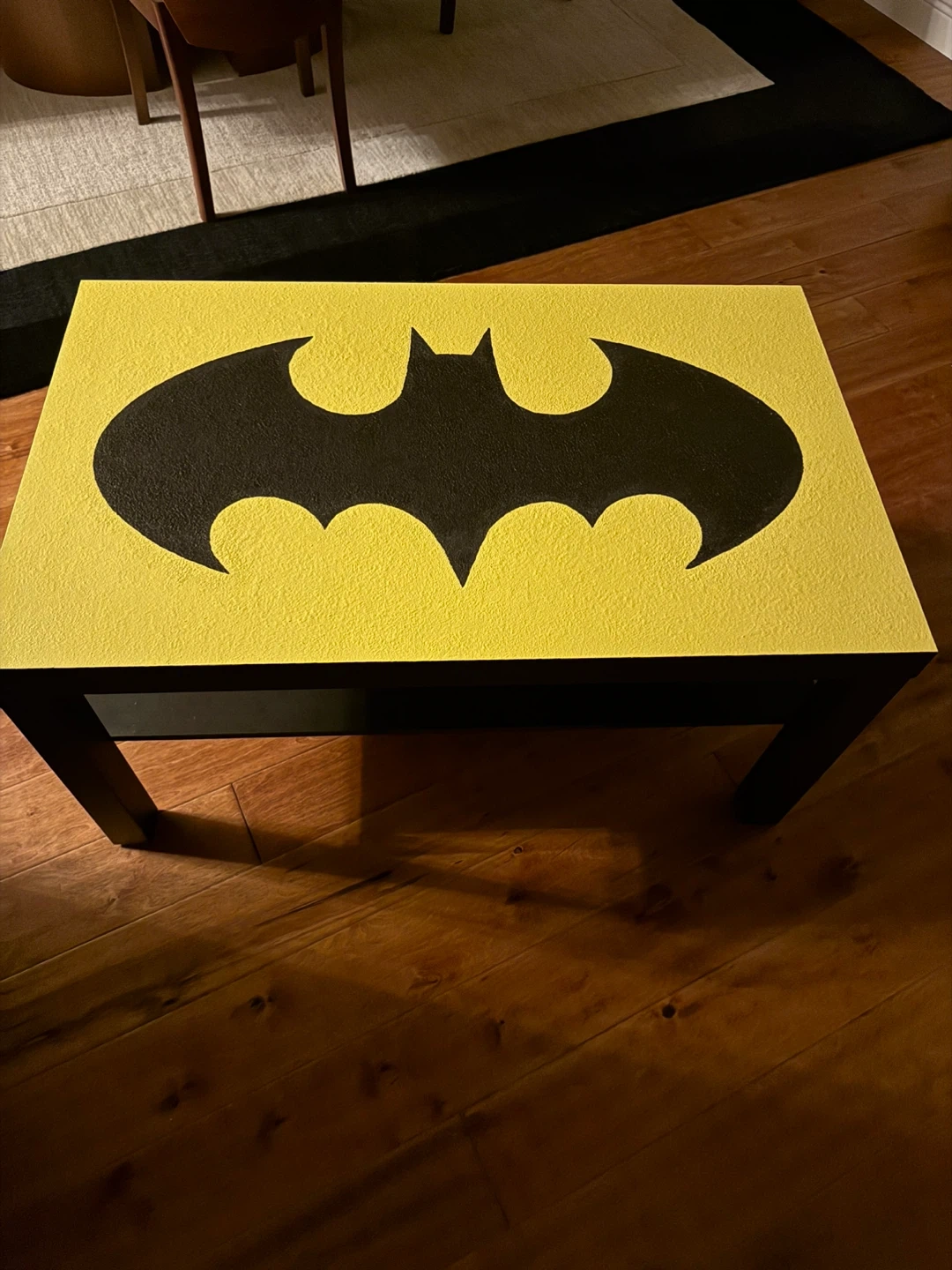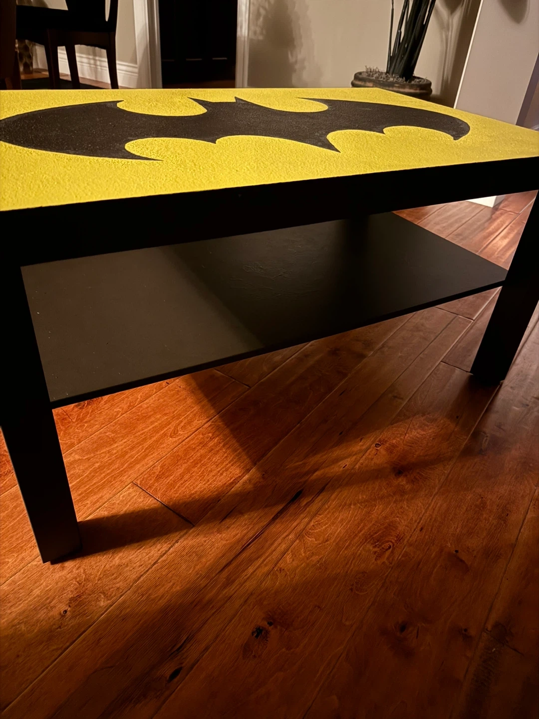 Black coffee table with a yellow top featuring the Batman logo. It has a convenient lower shelf for extra storage. Great for any Batman fan's living room!
