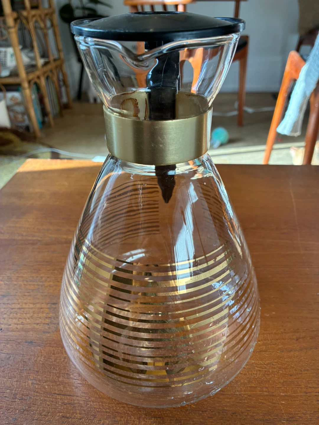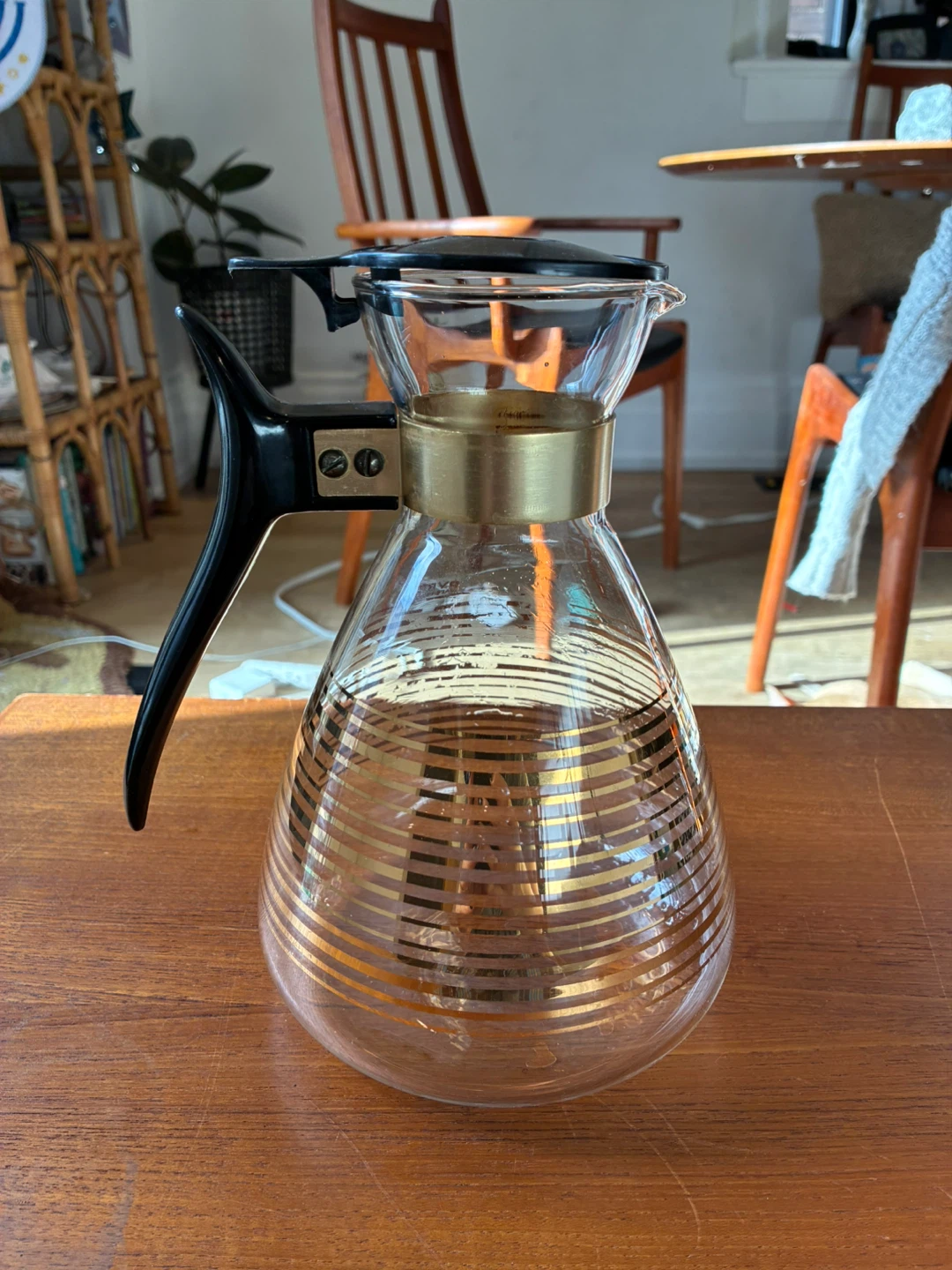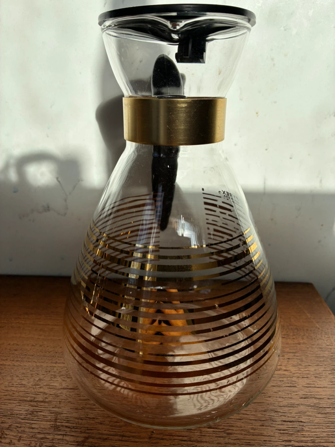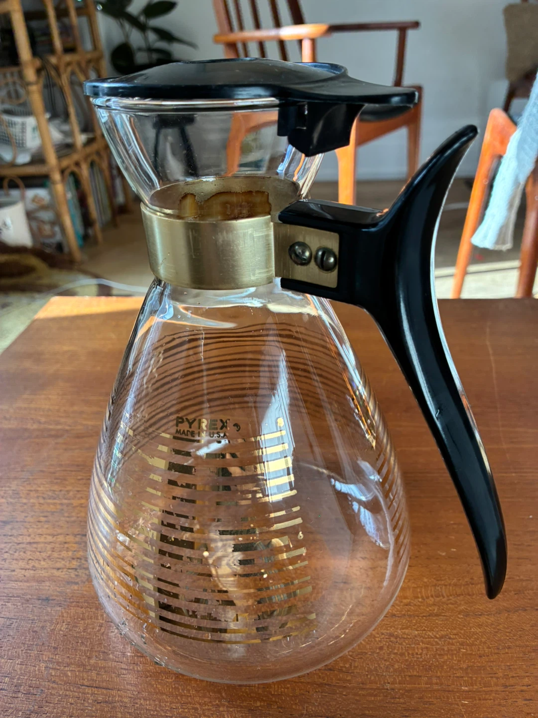 Selling a vintage Pyrex carafe with gold trim! It's in great shape and would look lovely on any table. Perfect for serving coffee or tea with a touch of retro elegance