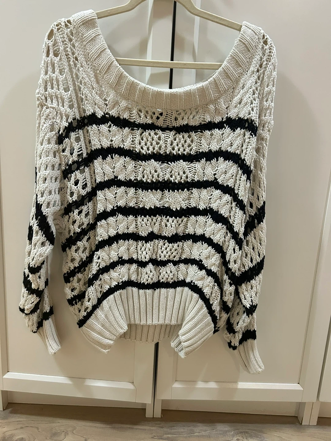 Cream and black striped crochet sweater. It's a loose-knit design with a boat neckline and ribbed cuffs and hem. This top is perfect for layering over a camisole or bralette during transitional weather.