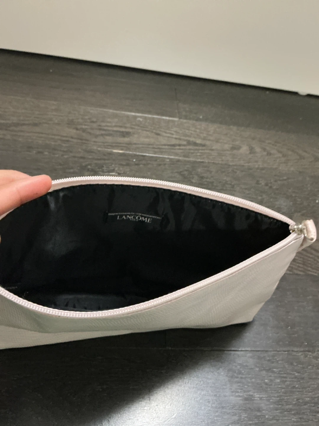 This is a pink cosmetic pouch from Lancôme. It's perfect for organizing makeup and toiletries. The interior is black and features the Lancôme logo.