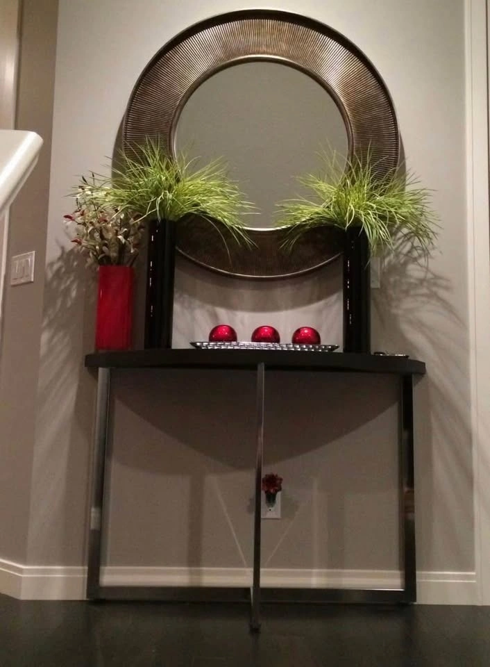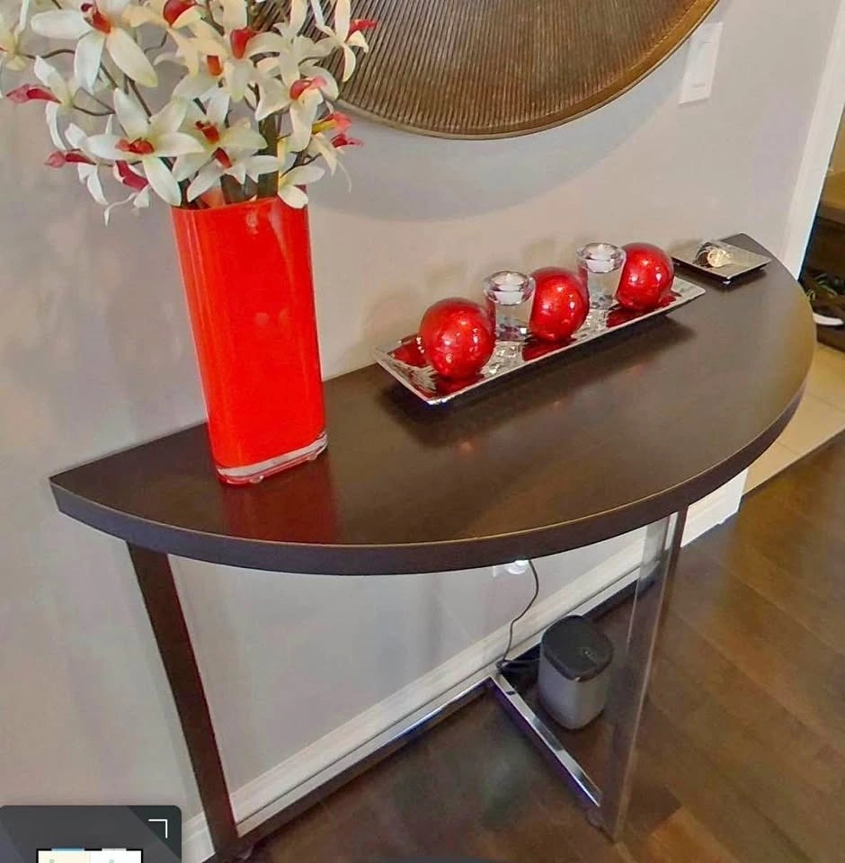 Dark wood-like toned console table with three chrome legs. Perfect for spaces that allow for easy movement around. Table only. Mirror and decor are not available. Dimensions: 47" W x 17" D x 32" H.