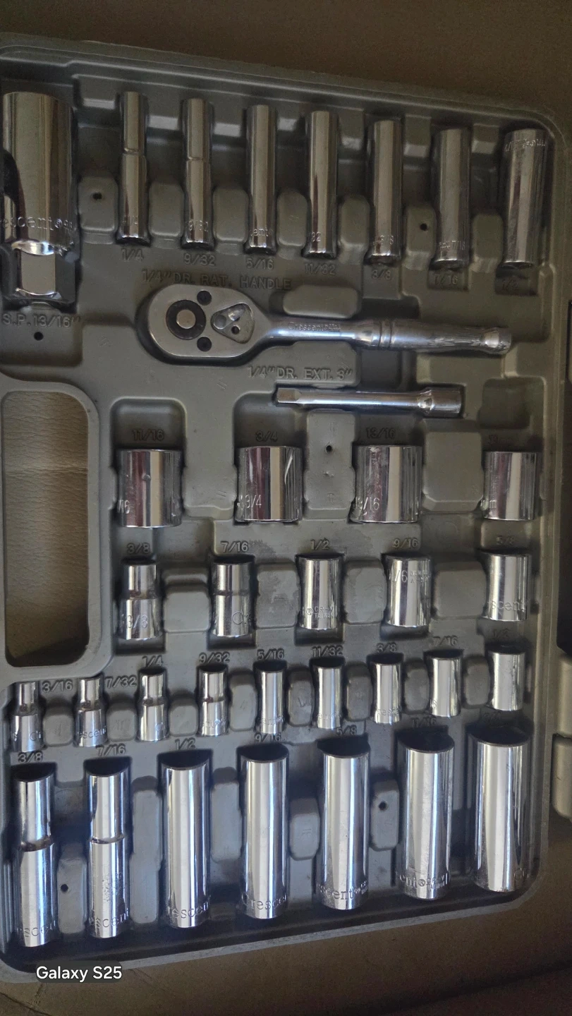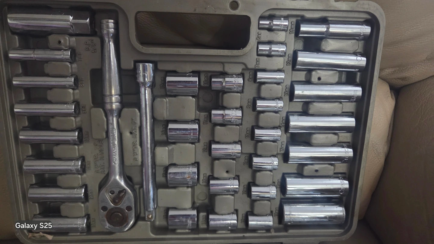 This is a socket wrench set in a grey carrying case. It includes a ratcheting handle and a variety of sockets. The case keeps everything organized and portable.
