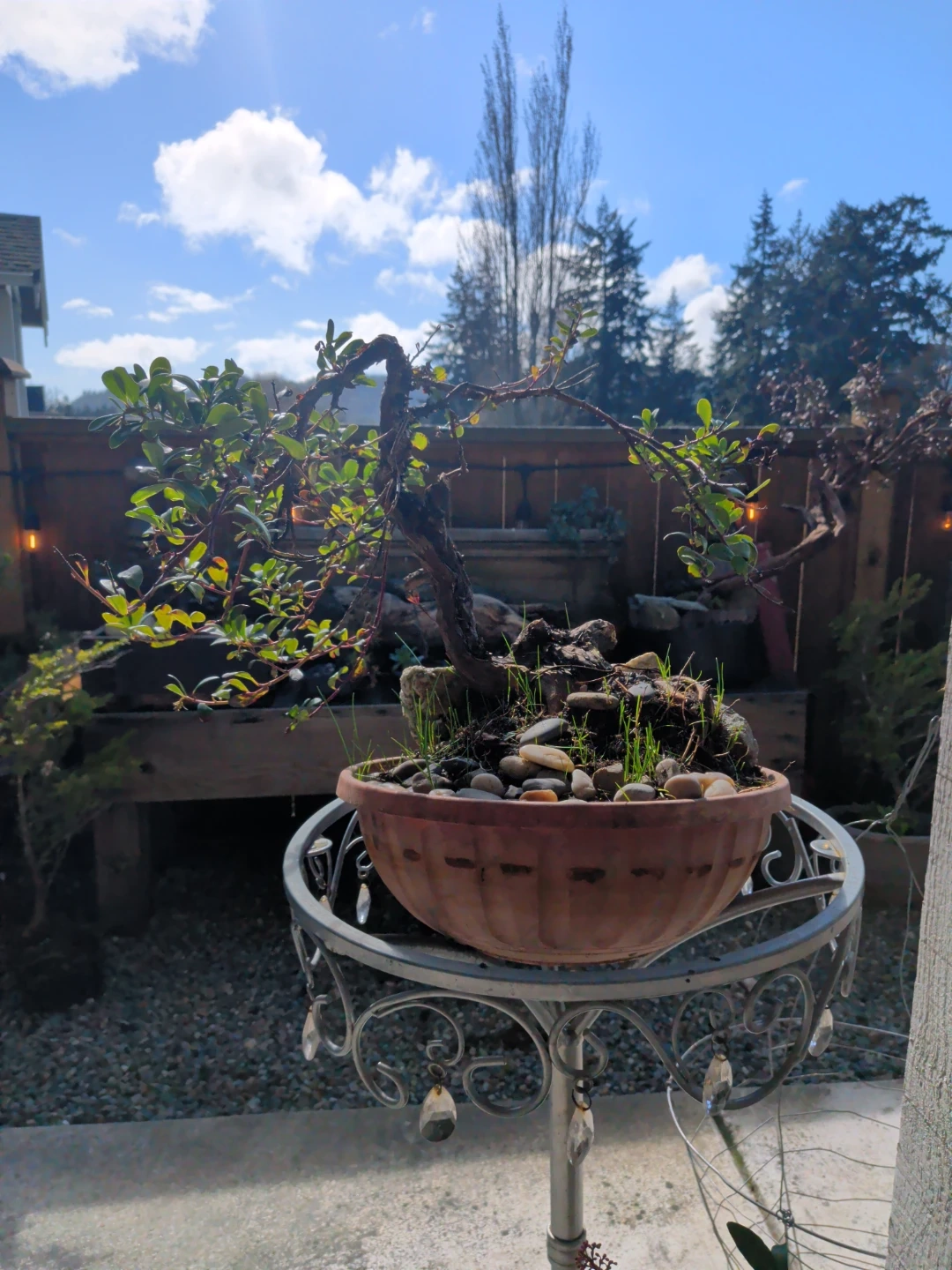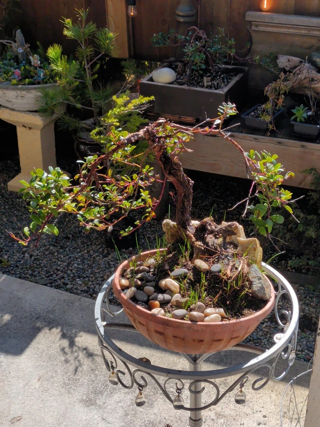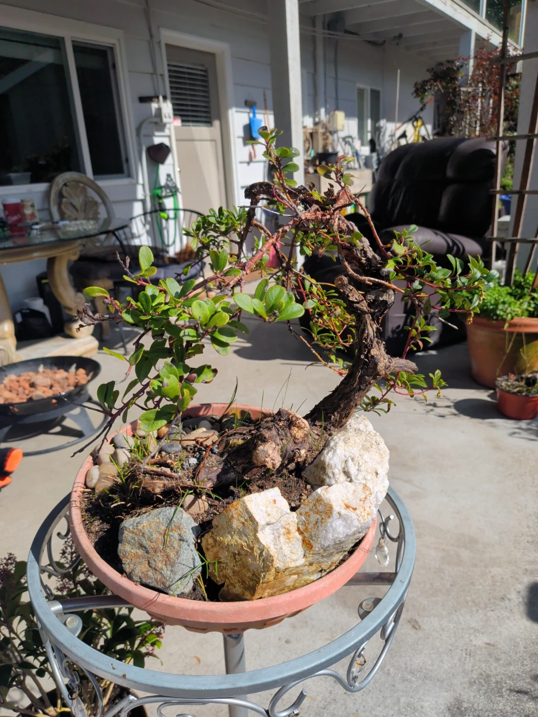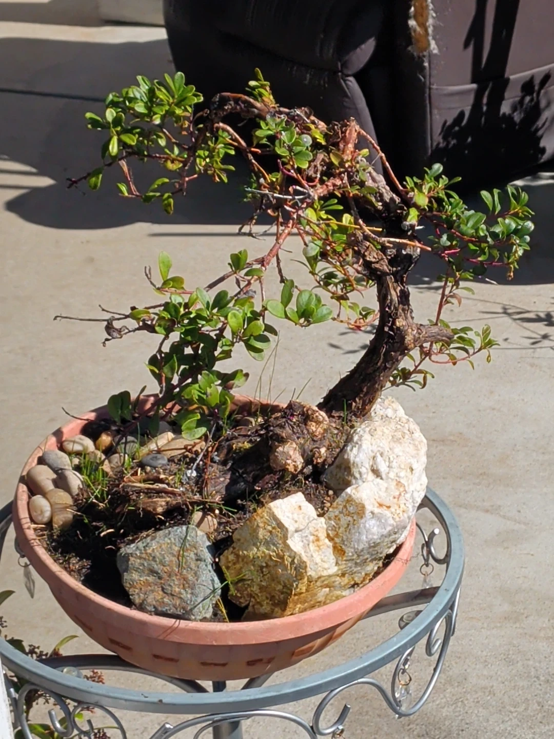 This is a mature bonsai tree planted in a decorative terracotta pot with stones and grass accents. It's a unique piece for any plant enthusiast. Would look great on a patio or in a sunroom!