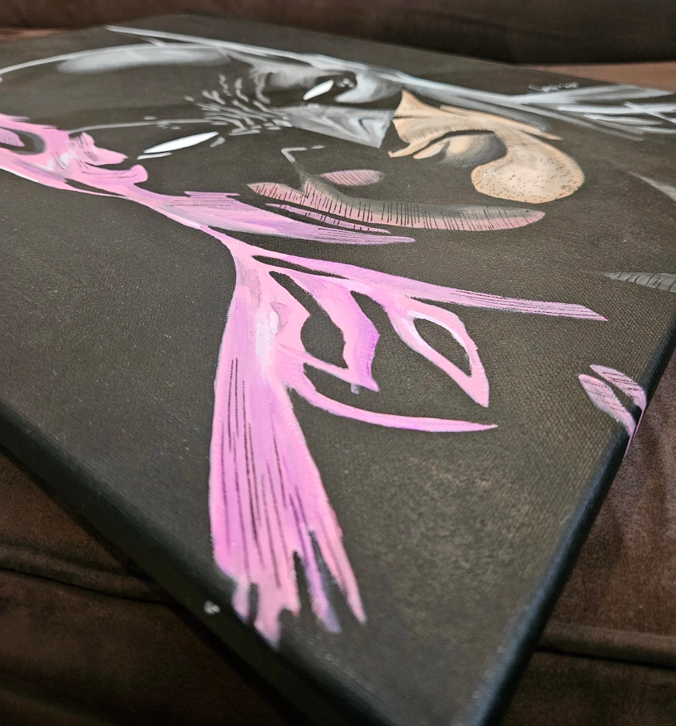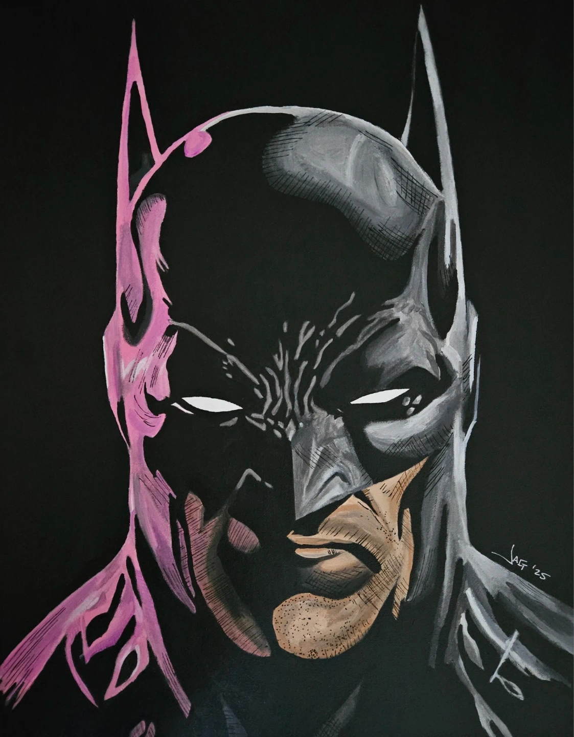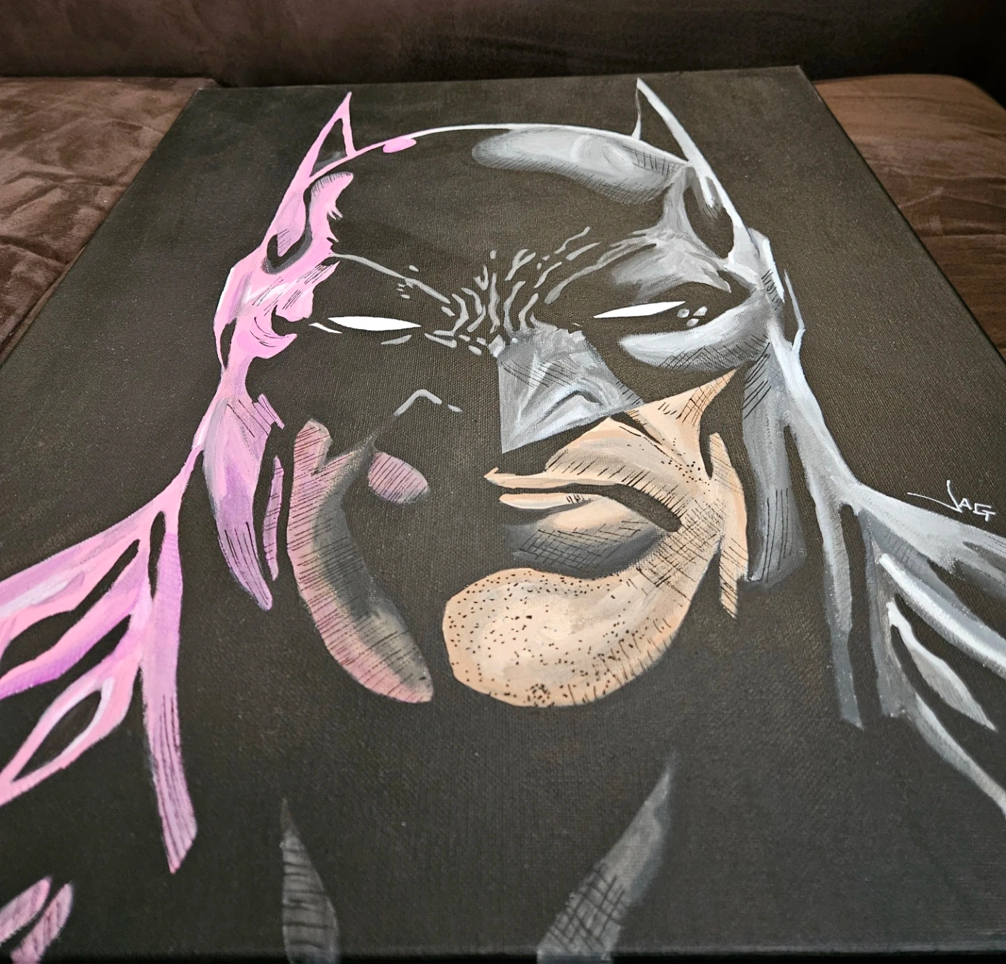 This is a 16"x20" acrylic painting of Batman on canvas. It features a close-up portrait with bold lines and contrasting colours. The artwork is signed.