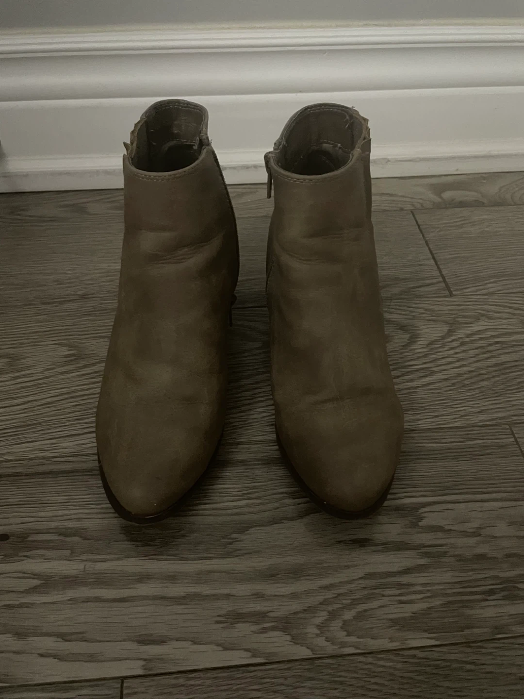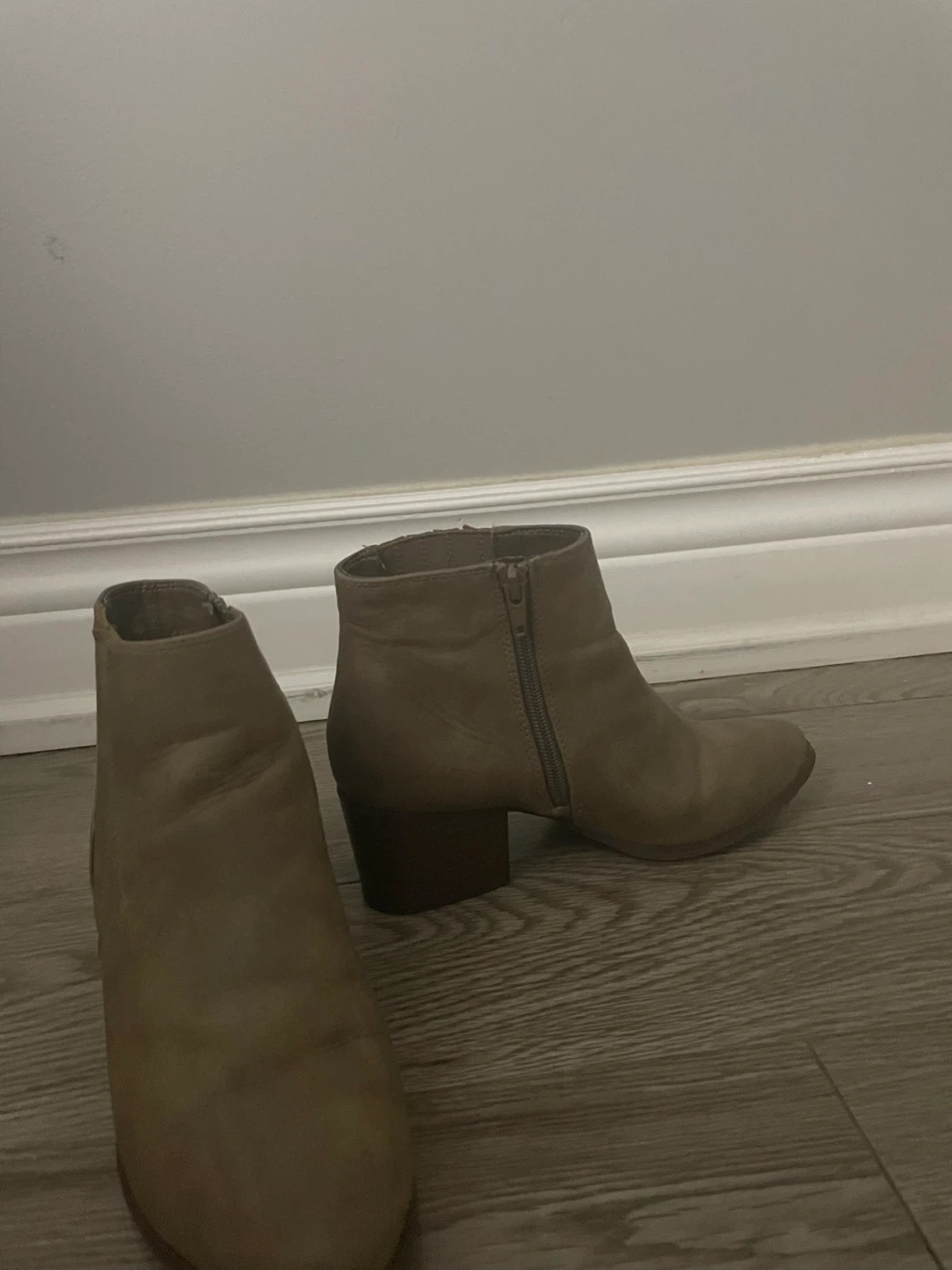 These tan ankle boots feature a stylish block heel and a side zipper for easy wear. They're made of a faux suede material. These boots are great for dressing up or down! Pick up only. Cash only please.