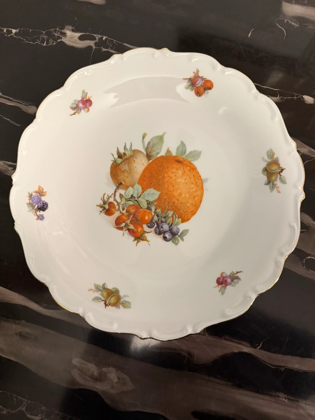 Decorative porcelain serving plate featuring a vibrant fruit illustration. Scalloped edge with gold trim. It's suitable for serving desserts or as a decorative accent piece.