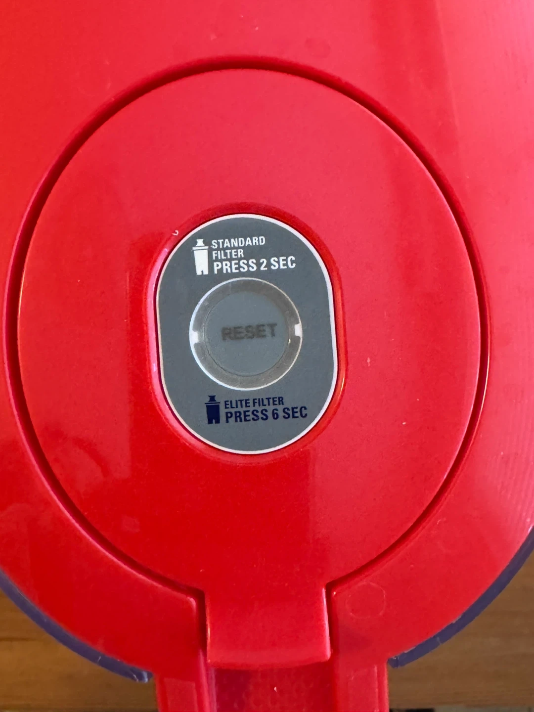 This Brita water filter pitcher comes in a vibrant red colour. It's designed to help you easily filter your drinking water at home. The lid has a reset indicator for filter changes.