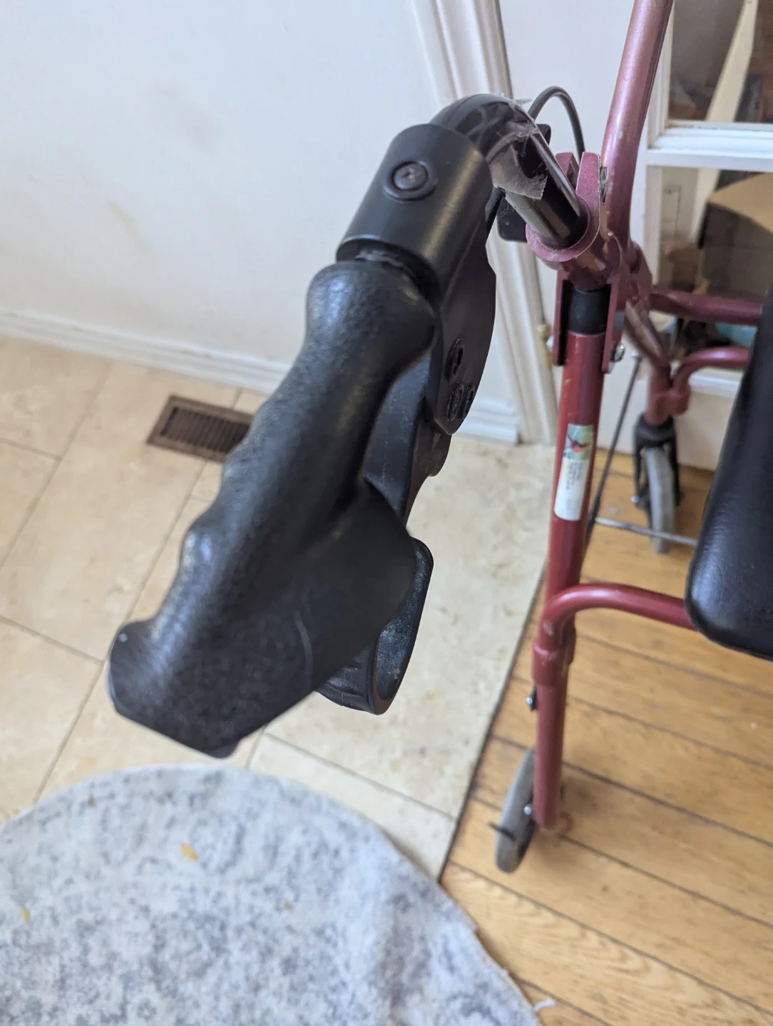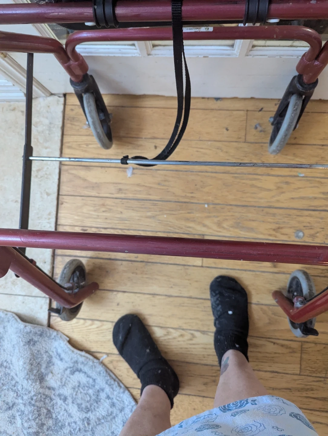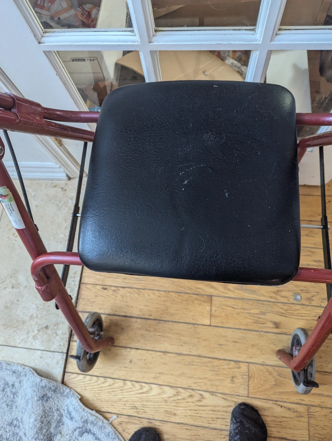 Selling a rolling walker with a seat. It's in good condition and ready to help someone get around comfortably. The seat is black and the frame is a reddish colour.