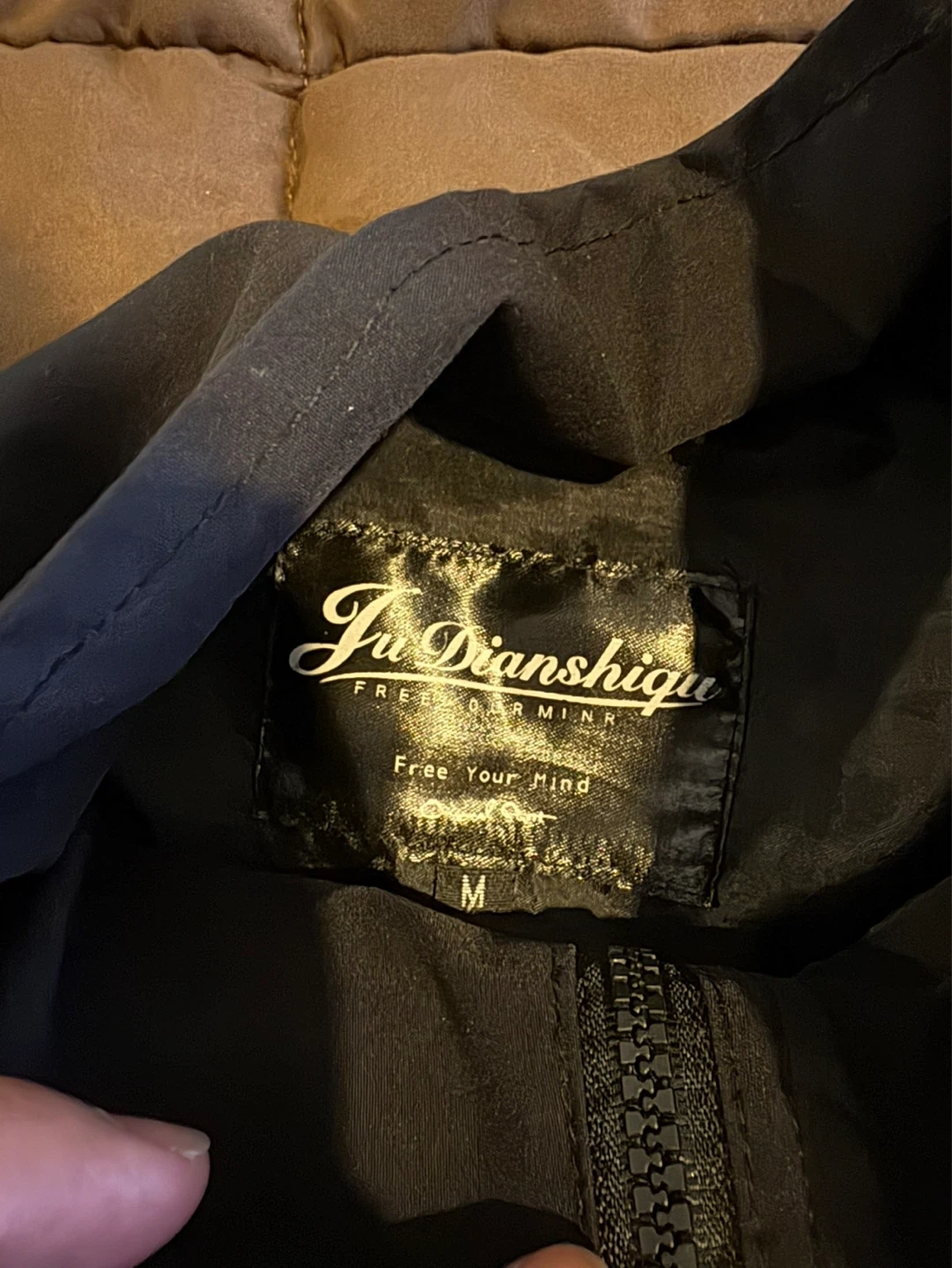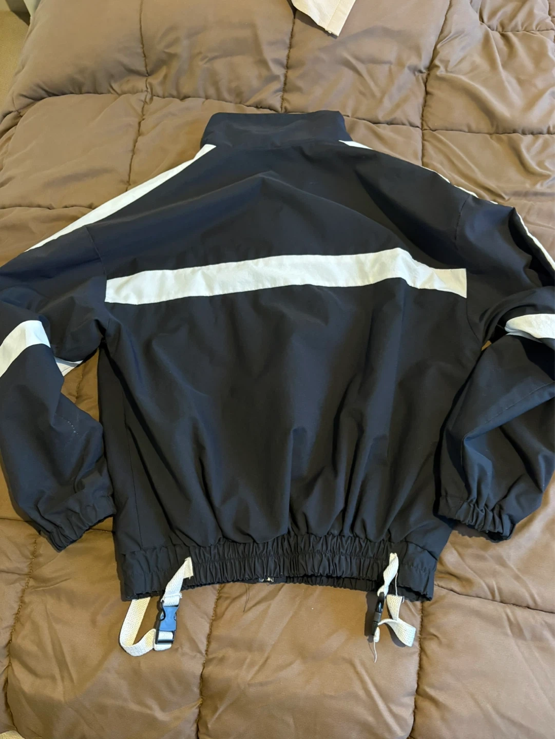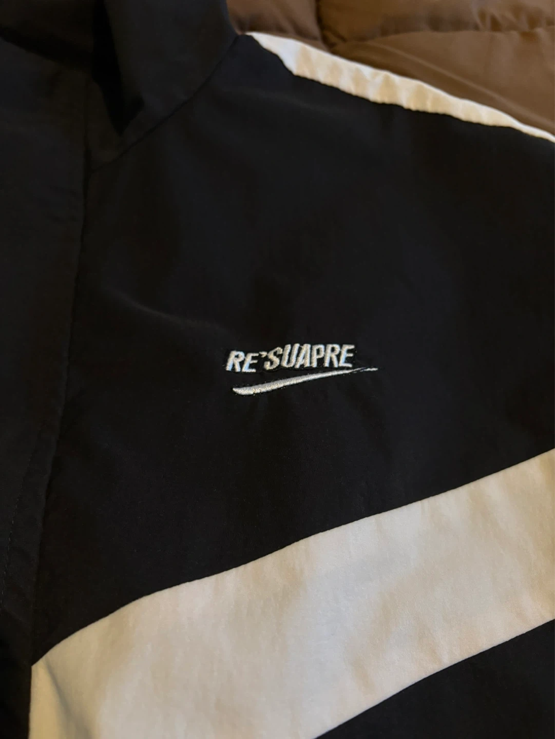 This is a black and white track jacket by RE'SUAPRE. It's a size medium. The jacket features a full zip closure and elasticated cuffs and hem.