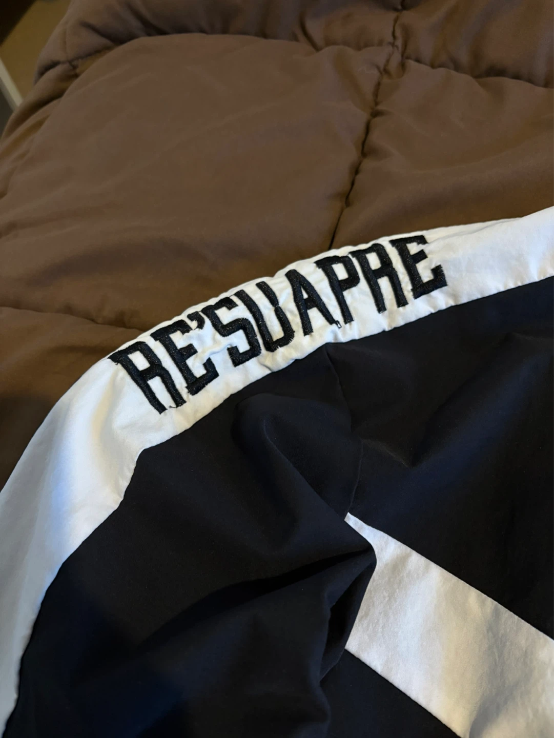 This is a black and white track jacket by RE'SUAPRE. It's a size medium. The jacket features a full zip closure and elasticated cuffs and hem.