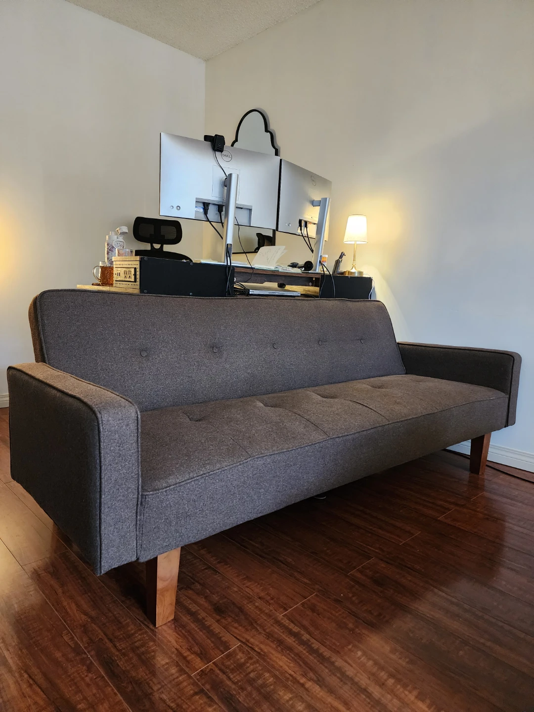 Selling a comfortable convertible sofa bed in a brown linen colour. It's in great condition and perfect for a living room or guest room. The sofa easily converts into a bed, making it ideal for small spaces or accommodating guests. It has a modern design with button-tufted detailing. The arms are removable for extra comfort when used as a bed.
