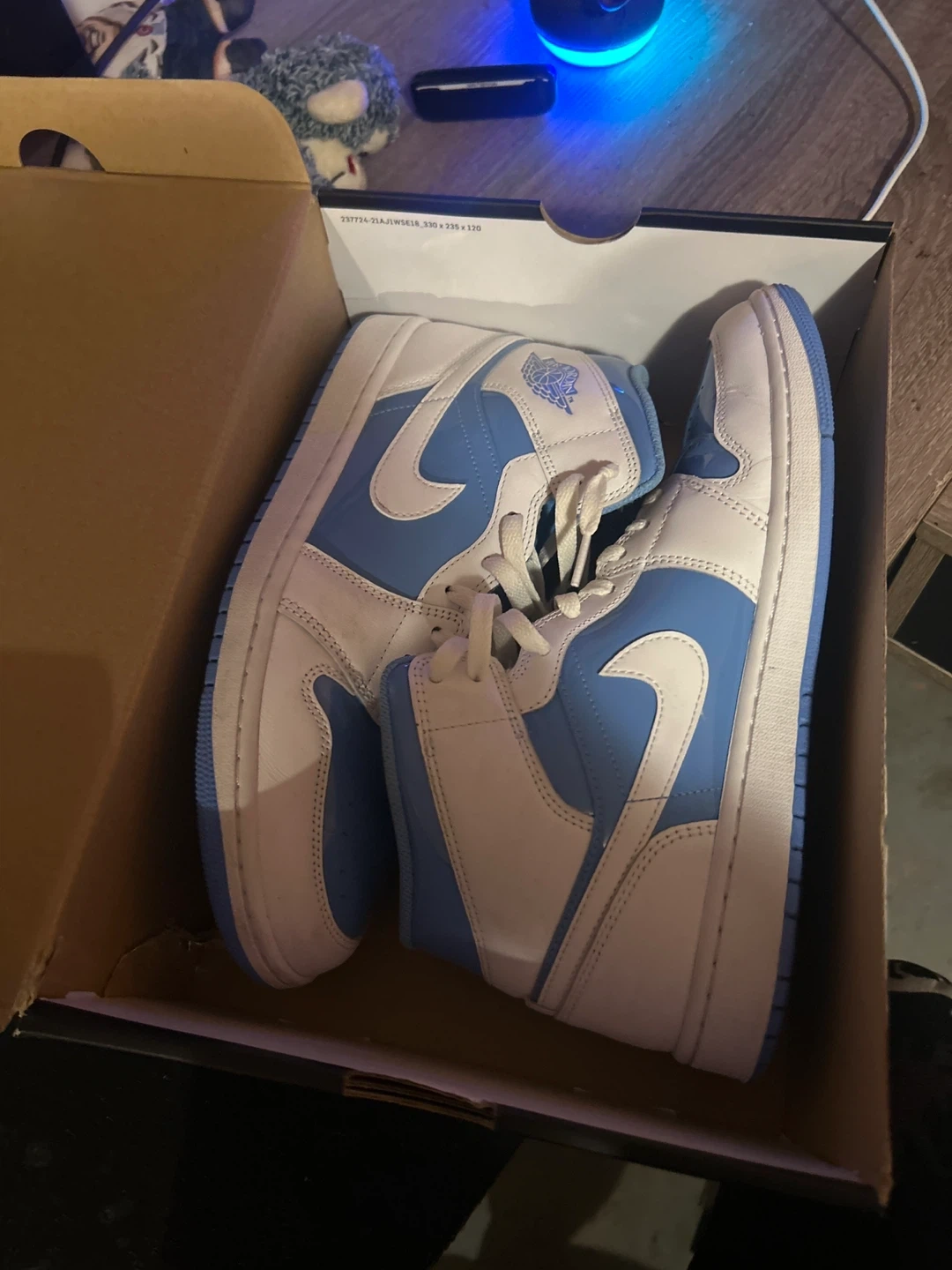 Classic Air Jordan 1 Mid SE sneakers in a clean white and University Blue colourway. Size 10.5 US men's. These kicks offer iconic style and comfort. Includes original box. Only worn once in the house I’d try them on.
