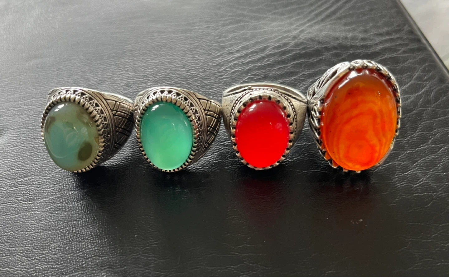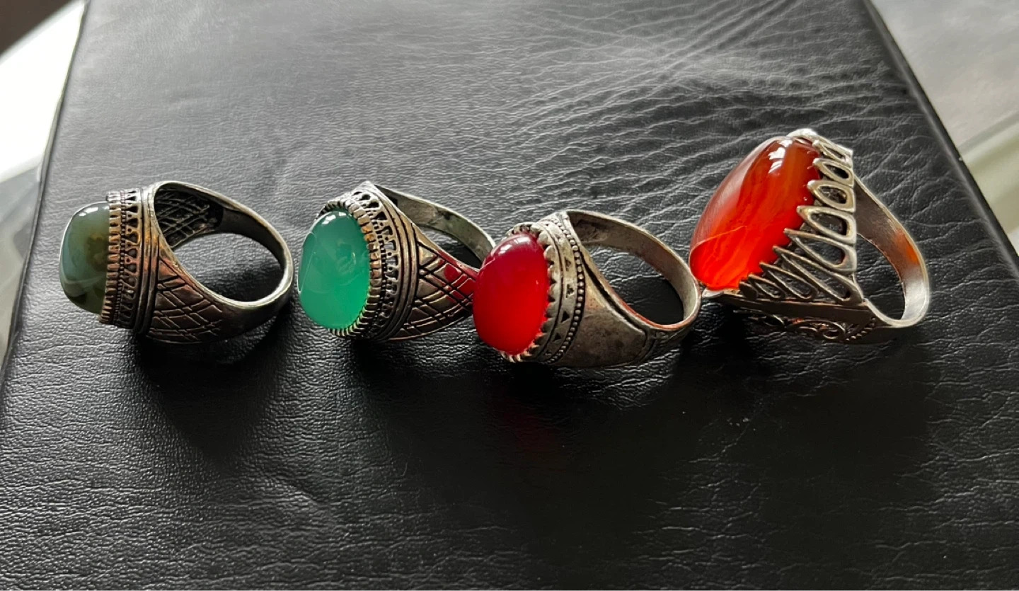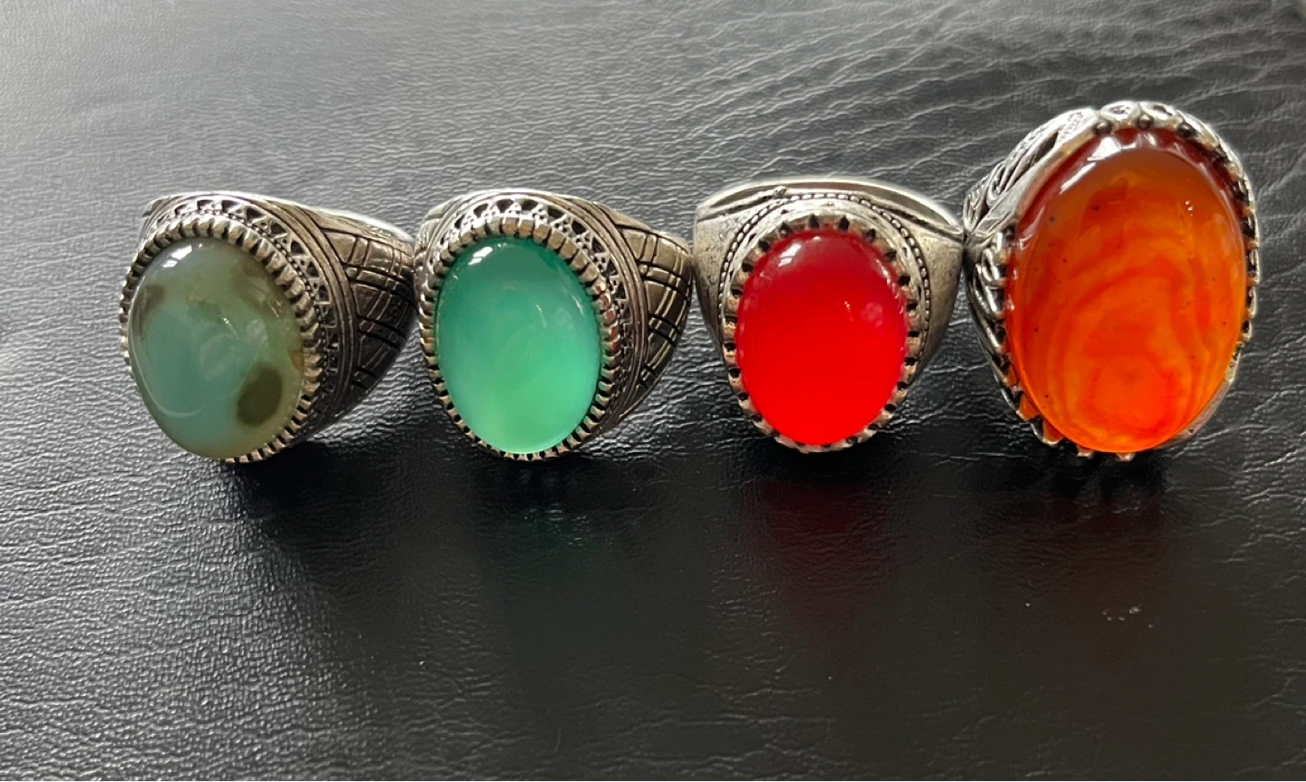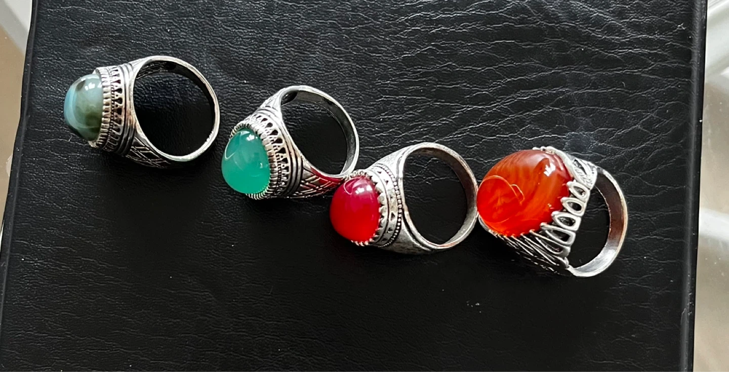 All 50 dollars limit periods Four men's rings featuring decorative silver-toned bands and colourful gemstone inlays. Includes green, teal, red, and orange stones. Great for adding a touch of flair!