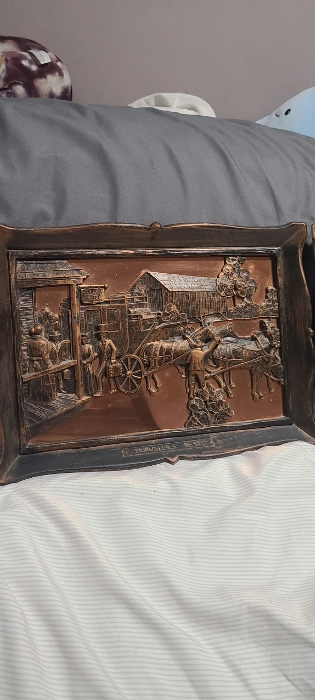 Two vintage copper art relief wall hangings depicting Canadian scenes. One shows "Maple Sugar Time" with log cabins and maple syrup collection. The other is titled "Travelers Rest" with a stagecoach scene. These pieces would suit a country-themed home.