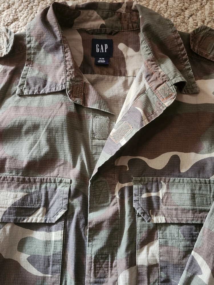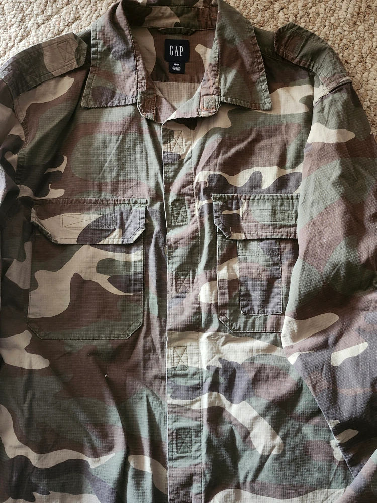 Long-sleeved shirt. Camo print. Multiple pockets. Great for layering or casual wear.