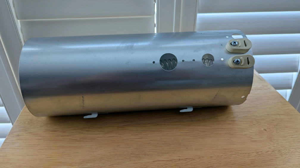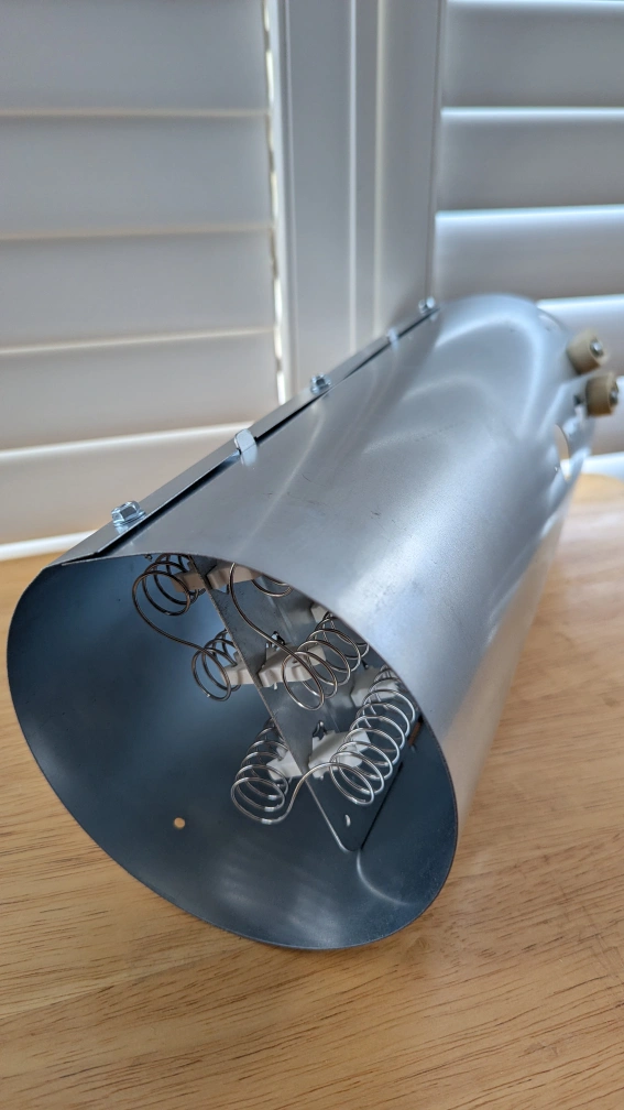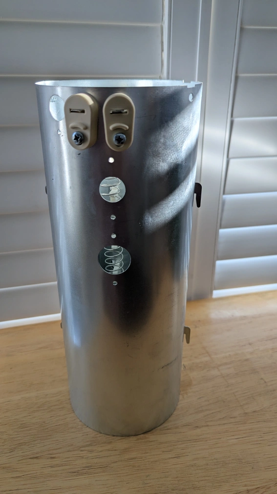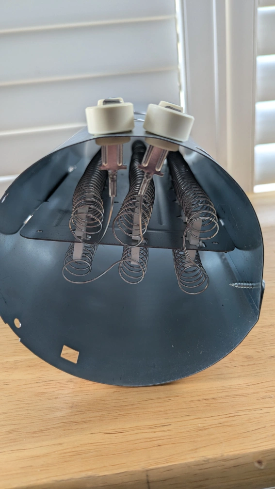 This is a replacement heating element for an appliance. It's made of metal coils within a metal cylinder. It has two connection points at the top.