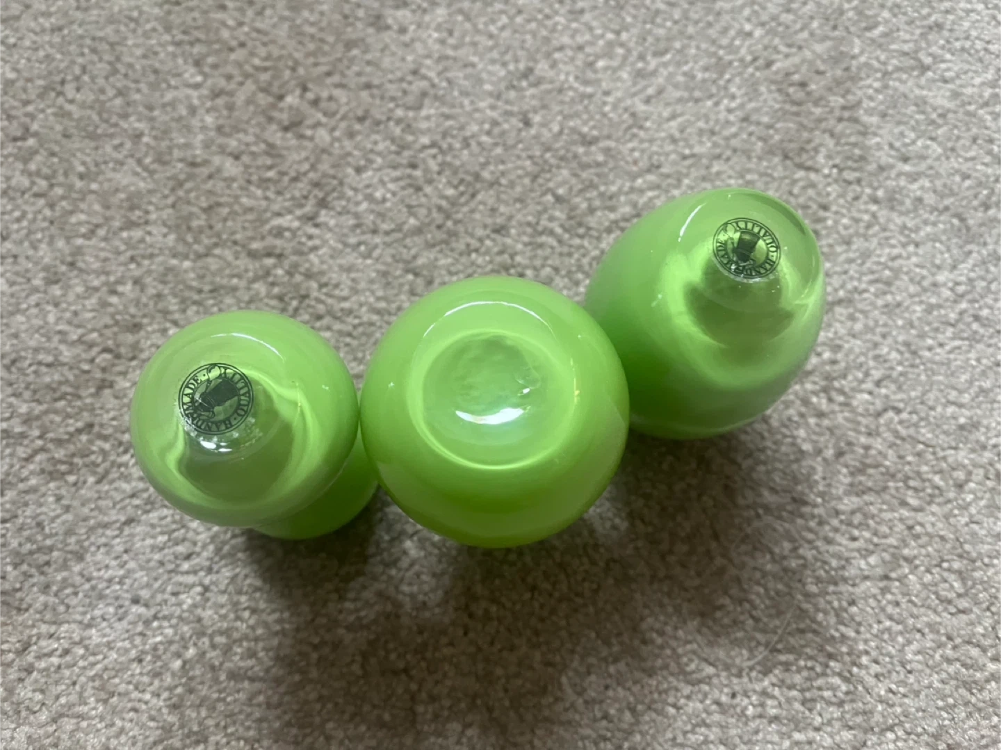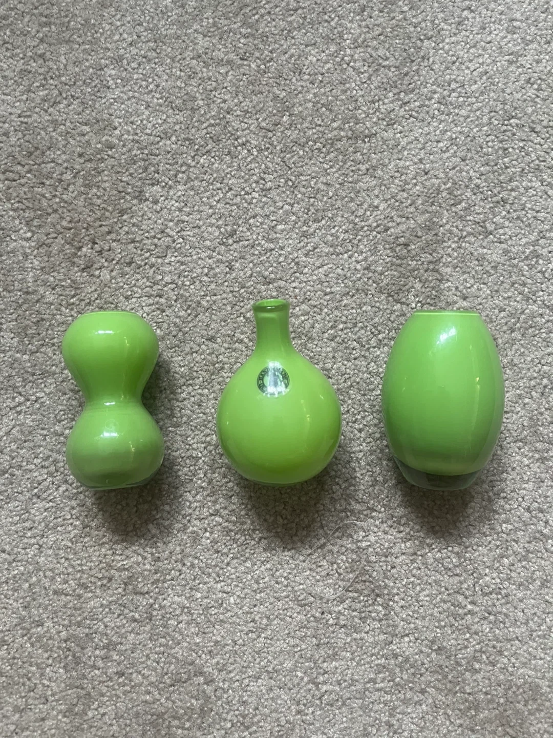 This is a set of three small green glass bud vases. They're made of a vibrant, glossy glass. Perfect for displaying single stems or small floral arrangements.