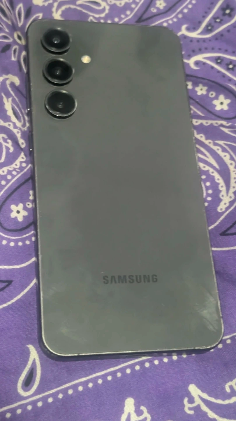 This is a Samsung Galaxy S24 FE smartphone in grey. It features a triple-lens camera system on the back. This phone has a sleek design with a modern aesthetic.