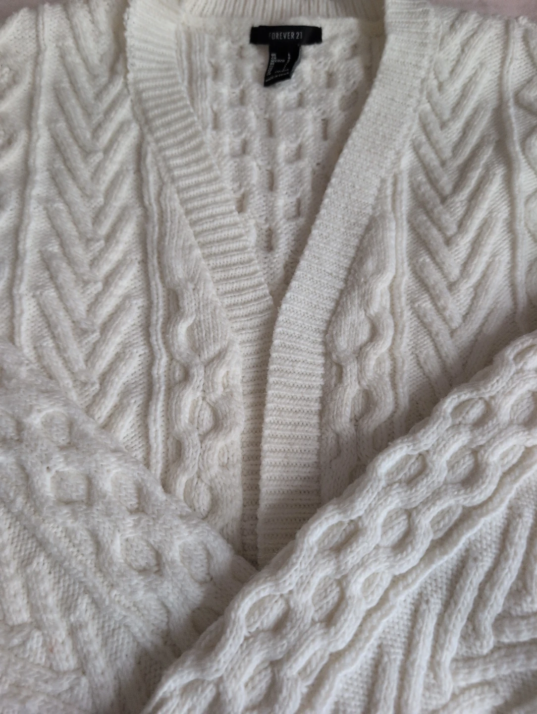 This cream cable knit cardigan from Forever 21 features a classic v-neck and buttonless front. It's a size large with a textured knit pattern throughout. It needs to be fixed near the collar