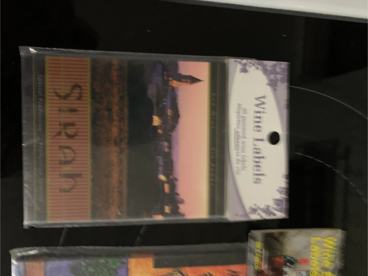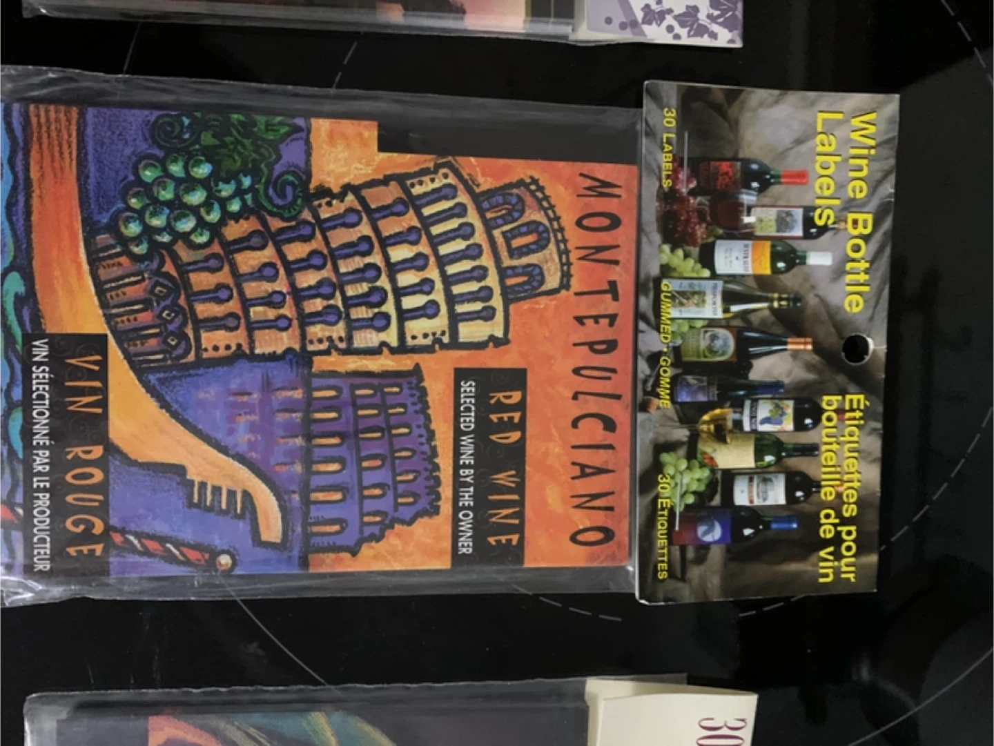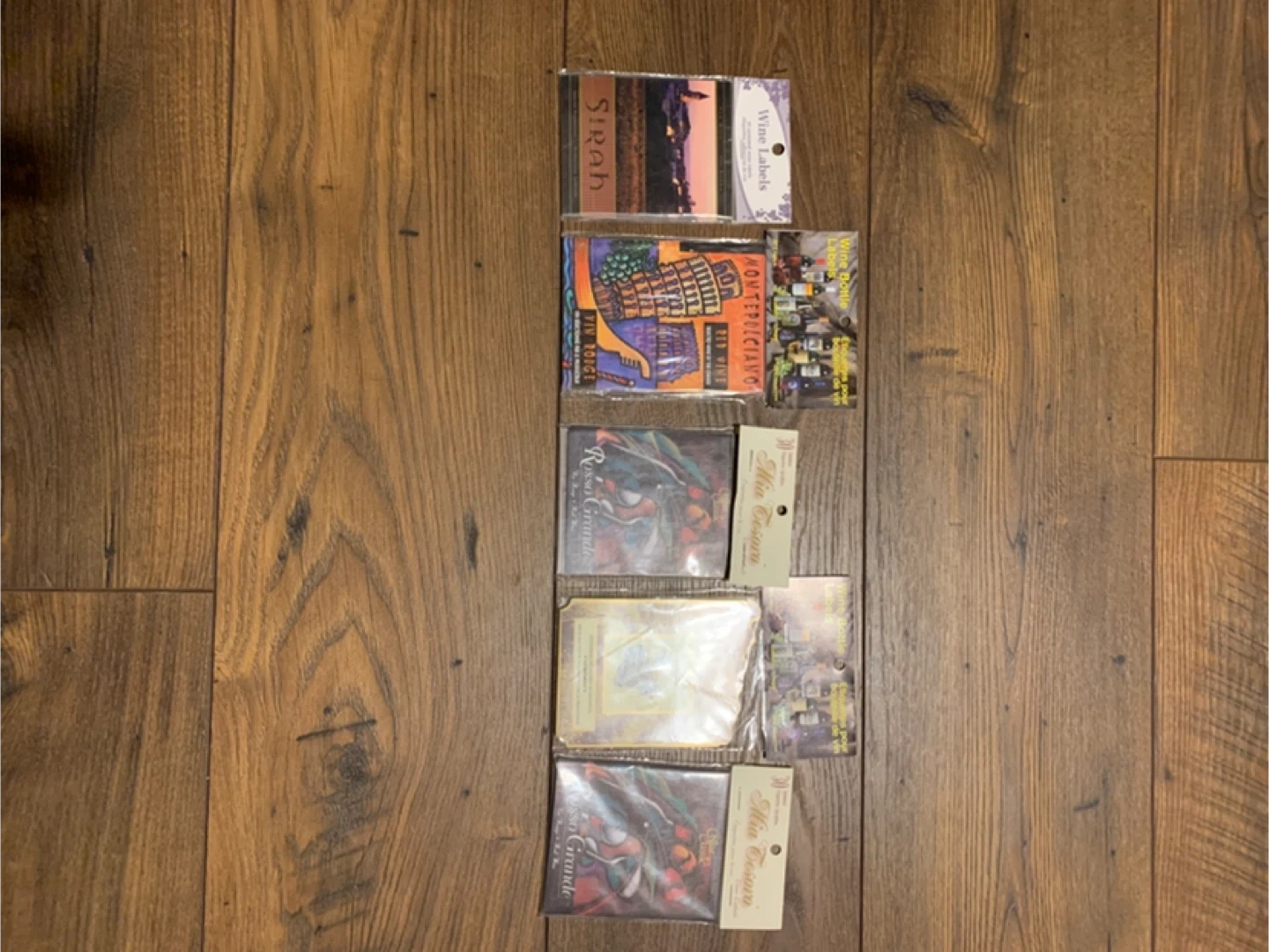 Selling assorted wine bottle labels for wine bottles. Includes "Private Stock Reserve Privée" with grapes, "Montepulciano Selected Wine by the Owner", "Rosso Grande", and "Sirah Special Production". Each package contains 30 gummed labels.
