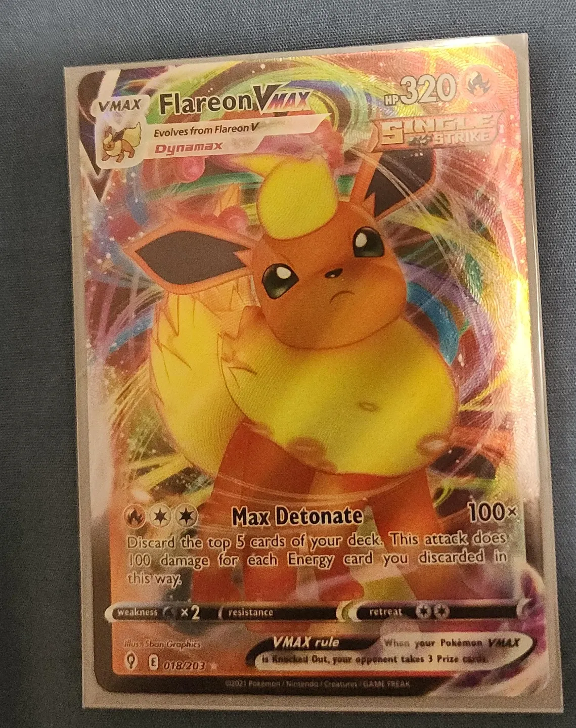 This is a Flareon VMAX Pokemon card from the Fusion Strike set, card number 018/203. It features the attack "Max Detonate" and has 320 HP. The card has a VMAX rule that states if it's knocked out, your opponent takes 3 prize cards.