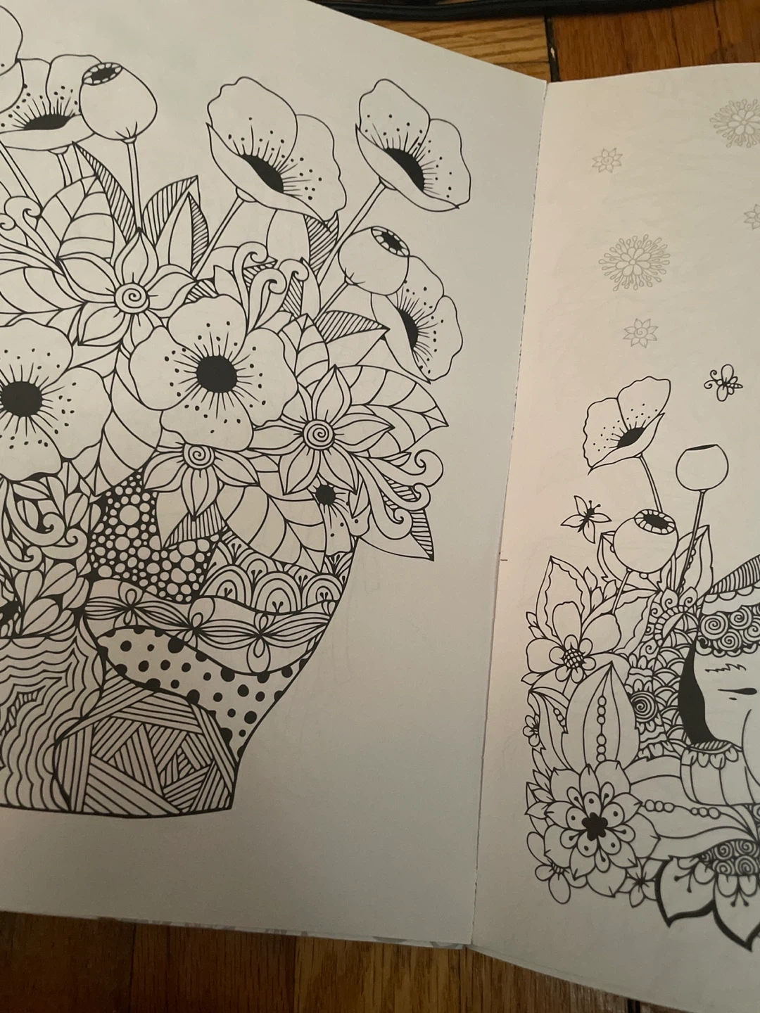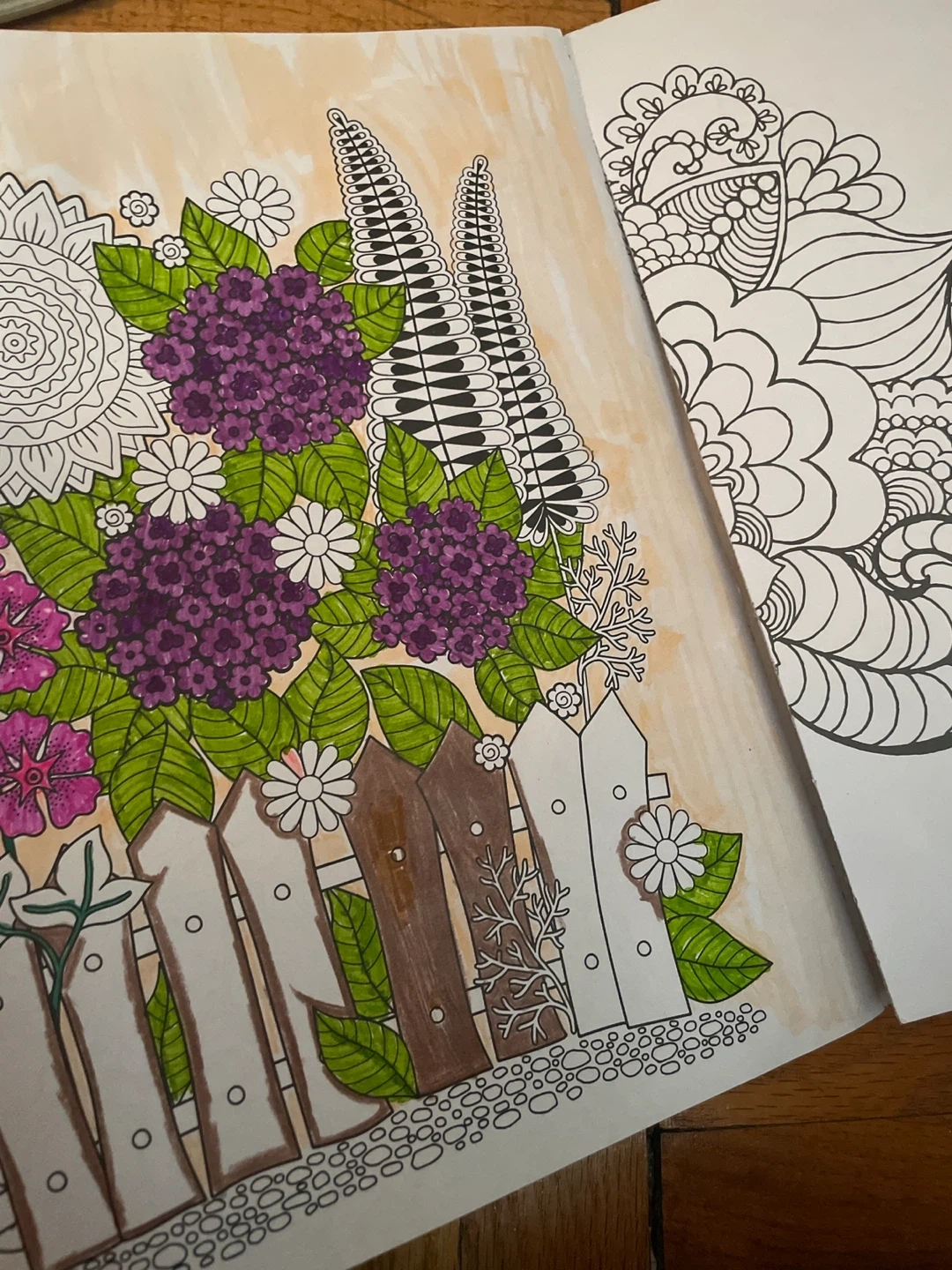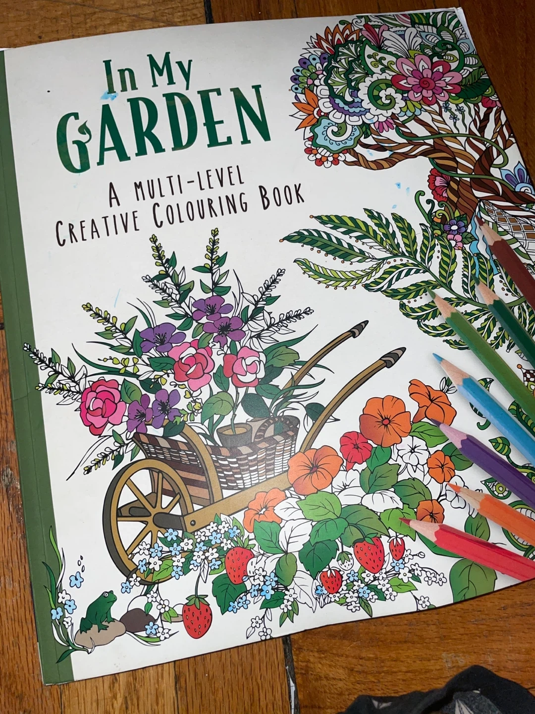 A multi-level creative colouring book titled 'In My Garden'. It features detailed floral and garden designs ready to be coloured. Great for relaxation and artistic expression!