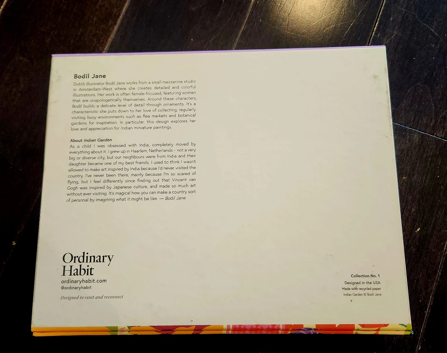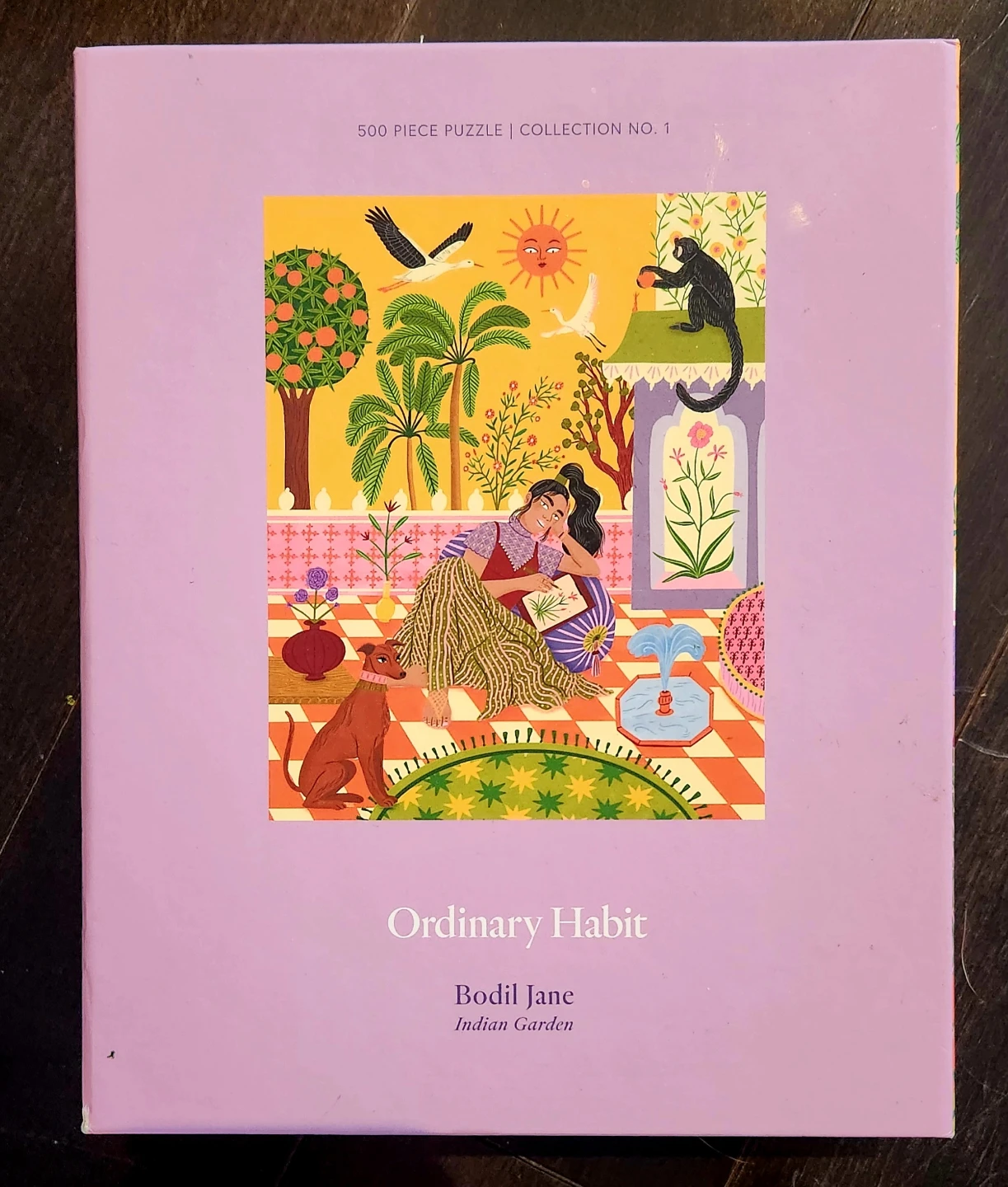 This Ordinary Habit puzzle features Bodil Jane's "Indian Garden" artwork. It's a 500-piece collection made with recycled paper. It's designed to help you reconnect and relax. All pieces accounted for. Only used once.