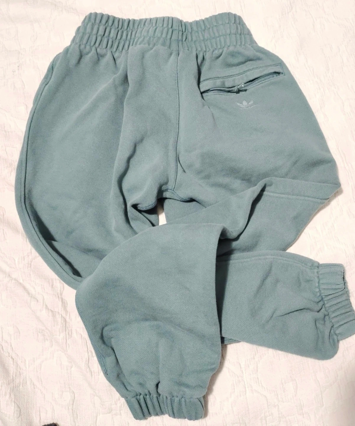 Adidas x Humanrace sweatpants in a nice teal colour. They're size XS and made in Vietnam. Comes with a drawstring waist and zippered pocket. These pants are great for lounging or casual wear!