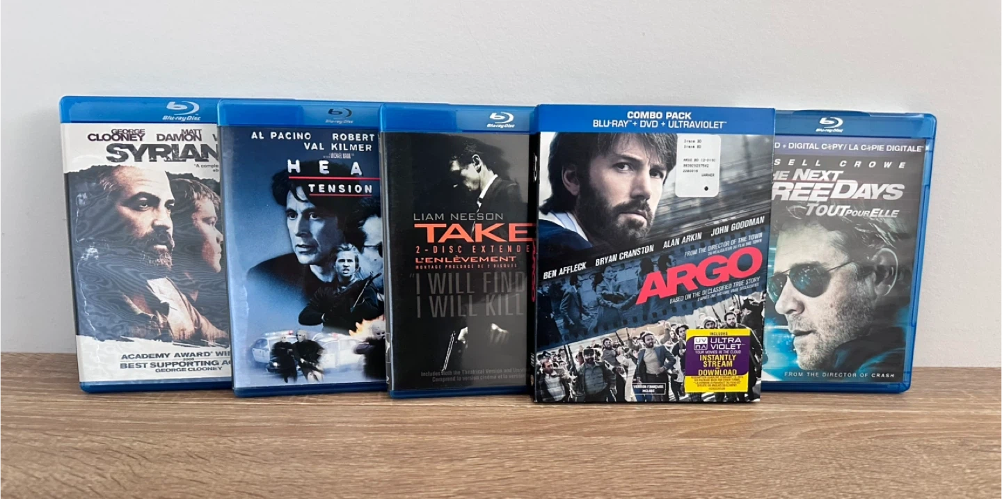 Includes five Blu-ray movies: Argo, Heat, Taken, Syriana, and The Next Three Days. All discs are in Blu-ray format. Great for movie nights at home!