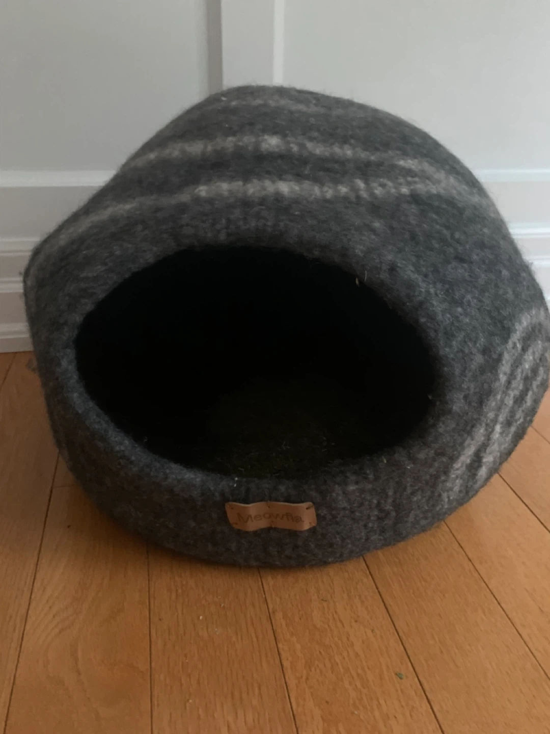 This felt cat bed cave provides a cozy and private space for your feline friend. It's made from durable felt material and features a stylish grey and white striped design. The enclosed cave shape offers security and warmth.