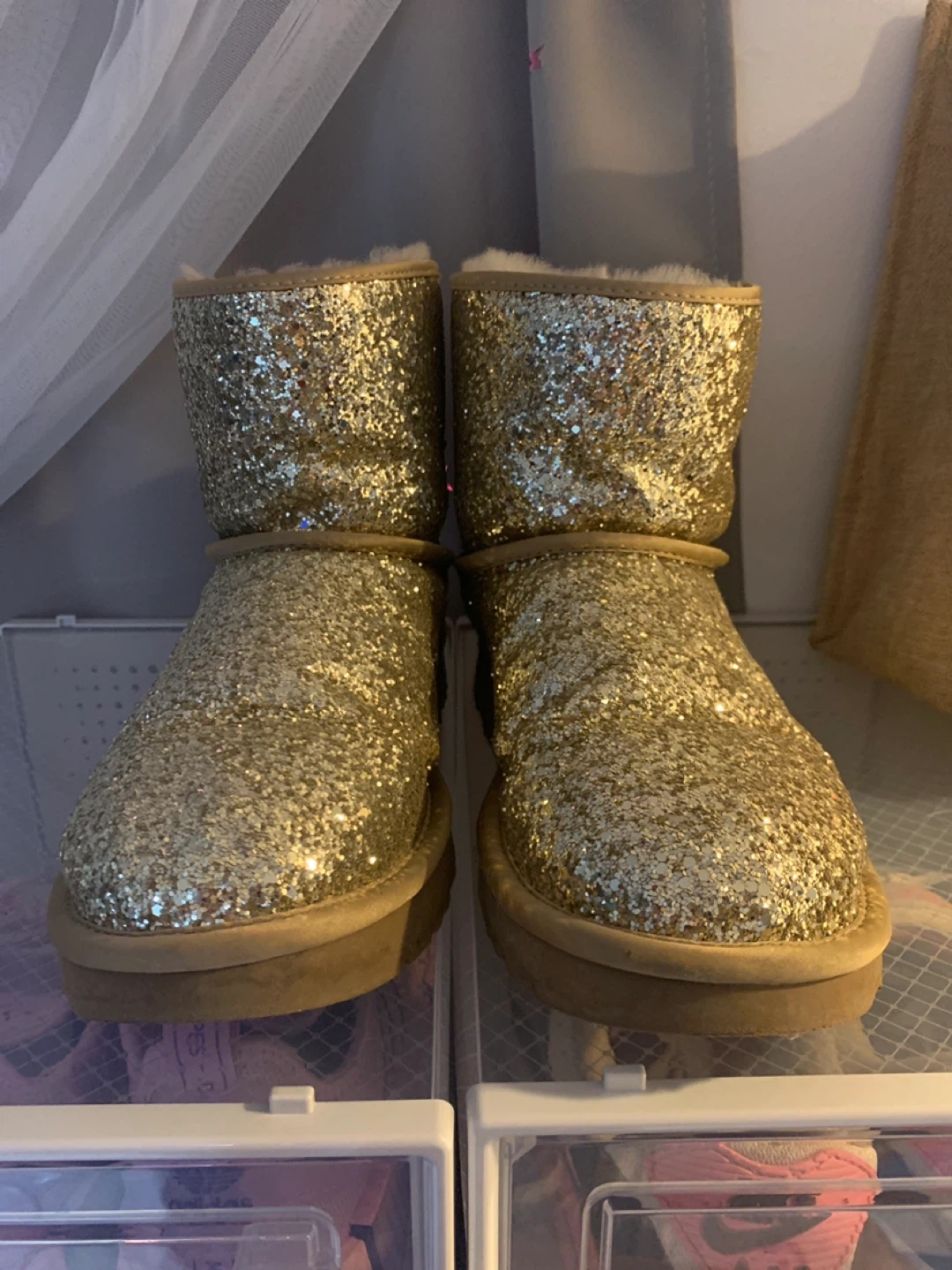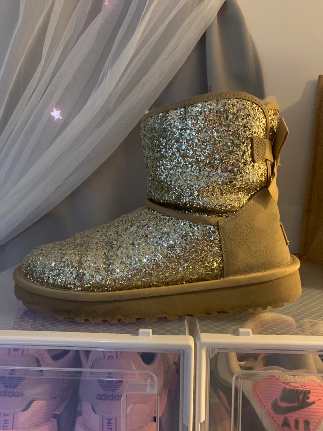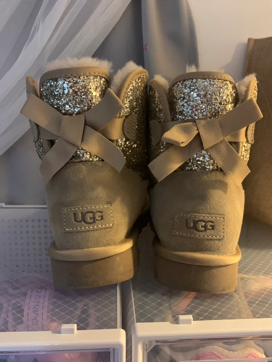These cute Ugg Bailey Bow II Glitter Boots are in great condition! They feature a glittery design and a bow detail on the back. Perfect for adding a bit of sparkle to any outfit