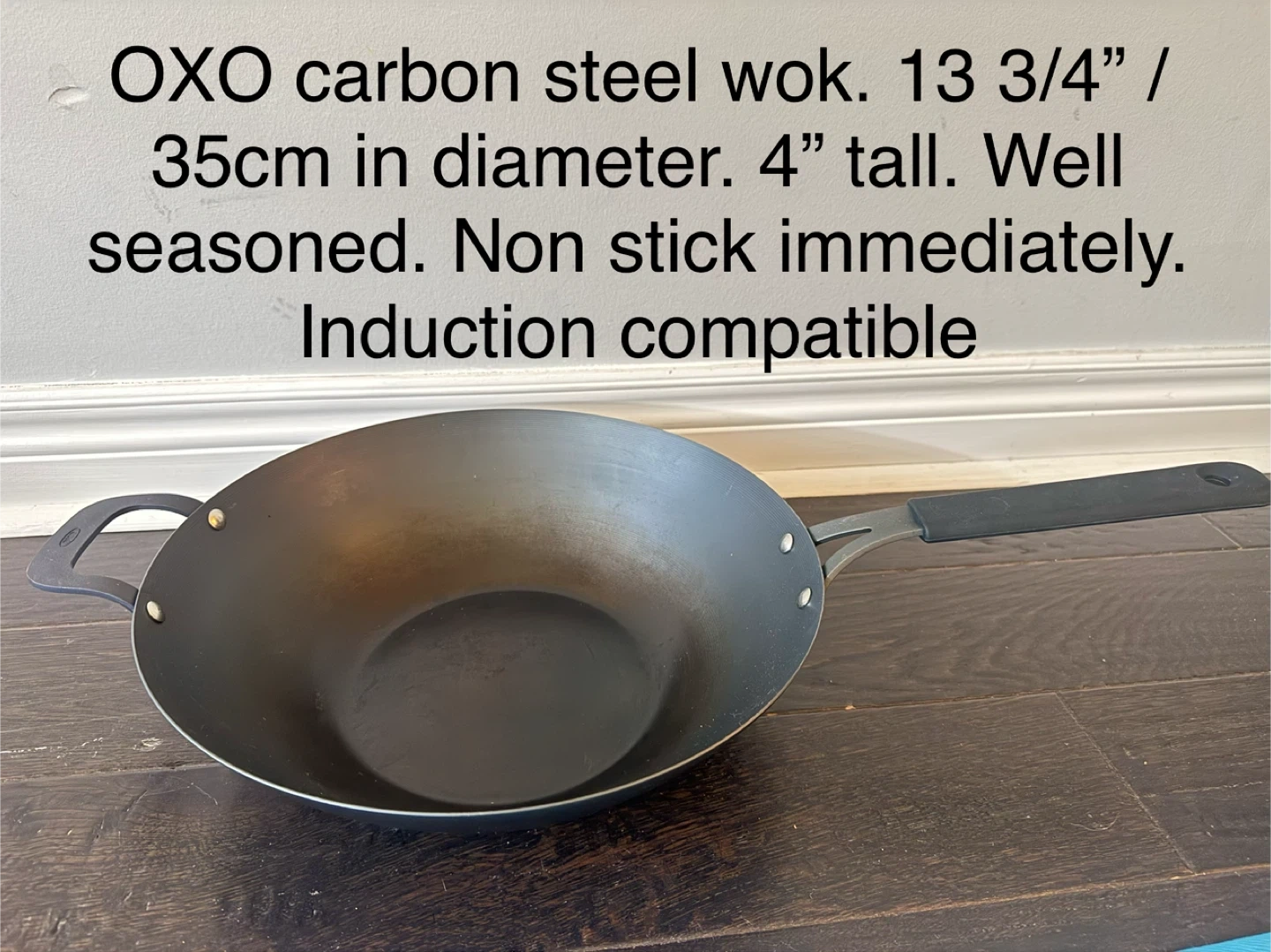 OXO carbon steel wok, 35cm in diameter and 4" tall. induction compatible. With fitted silicon handle to prevent your hands from getting burnt. This wok is well seasoned and ready for immediate non-stick cooking experience with right heat control.