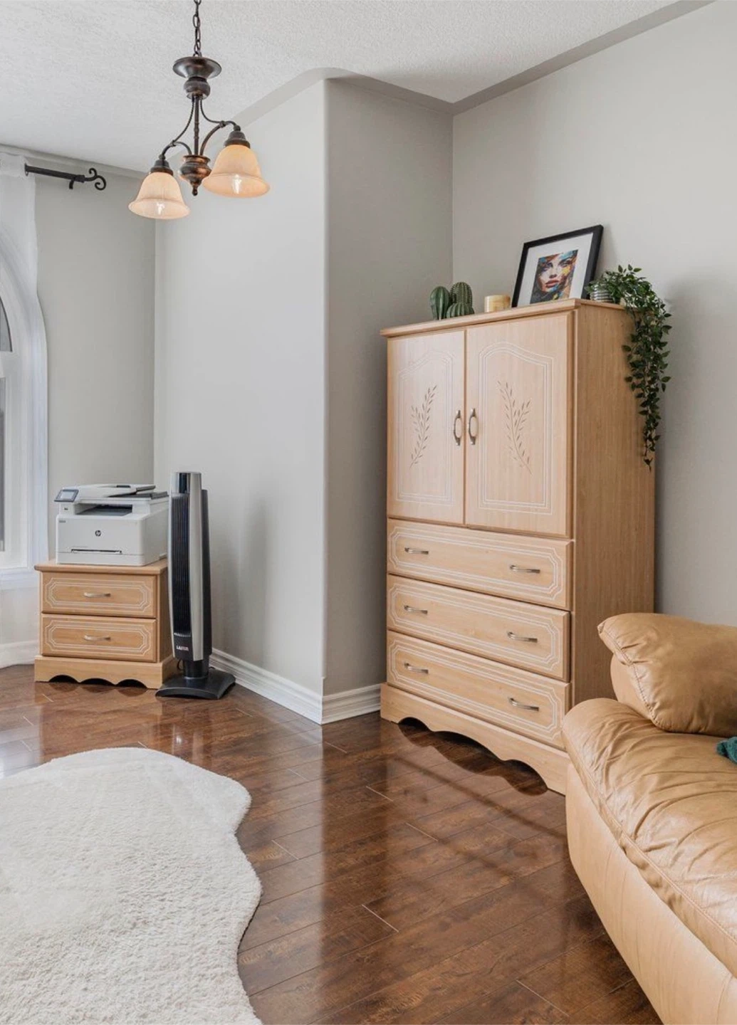 This light-coloured wooden dresser features two upper cabinets with decorative detailing and three spacious drawers below. It's a versatile piece for bedroom storage. The wood has a natural grain pattern. Includes a nightstand and headboard.